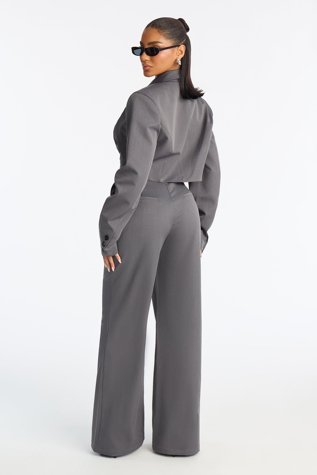 Available In Grey. Jumpsuit Moderate Stretch Blazer And Jumpsuit Set Halter Wide Leg Invisible Back Zipper Cropper Blazer Shoulder Pads Pockets 33" Inseam Top and Bottom Self: 96% Polyester 4% Spandex Top and Bottom Lining: 100% Polyester Imported