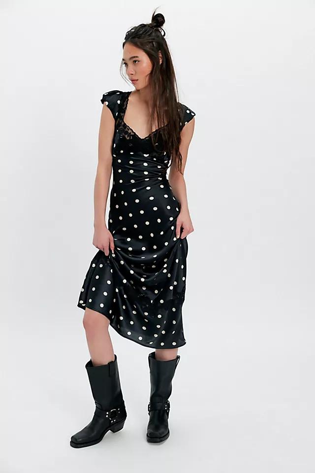 Perfect in polka dot, this stunning maxi dress is featured in a classic, A-line silhouette with butterfly lace-adorned neckline and slightly puffed capped sleeves for an added timeless touch.