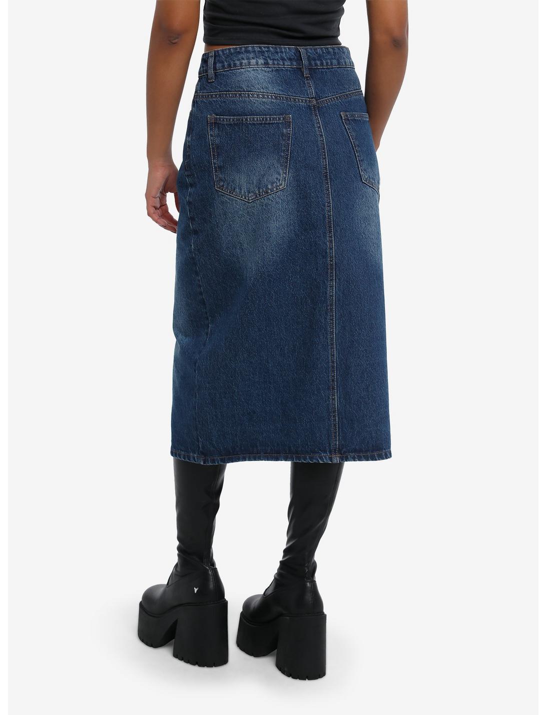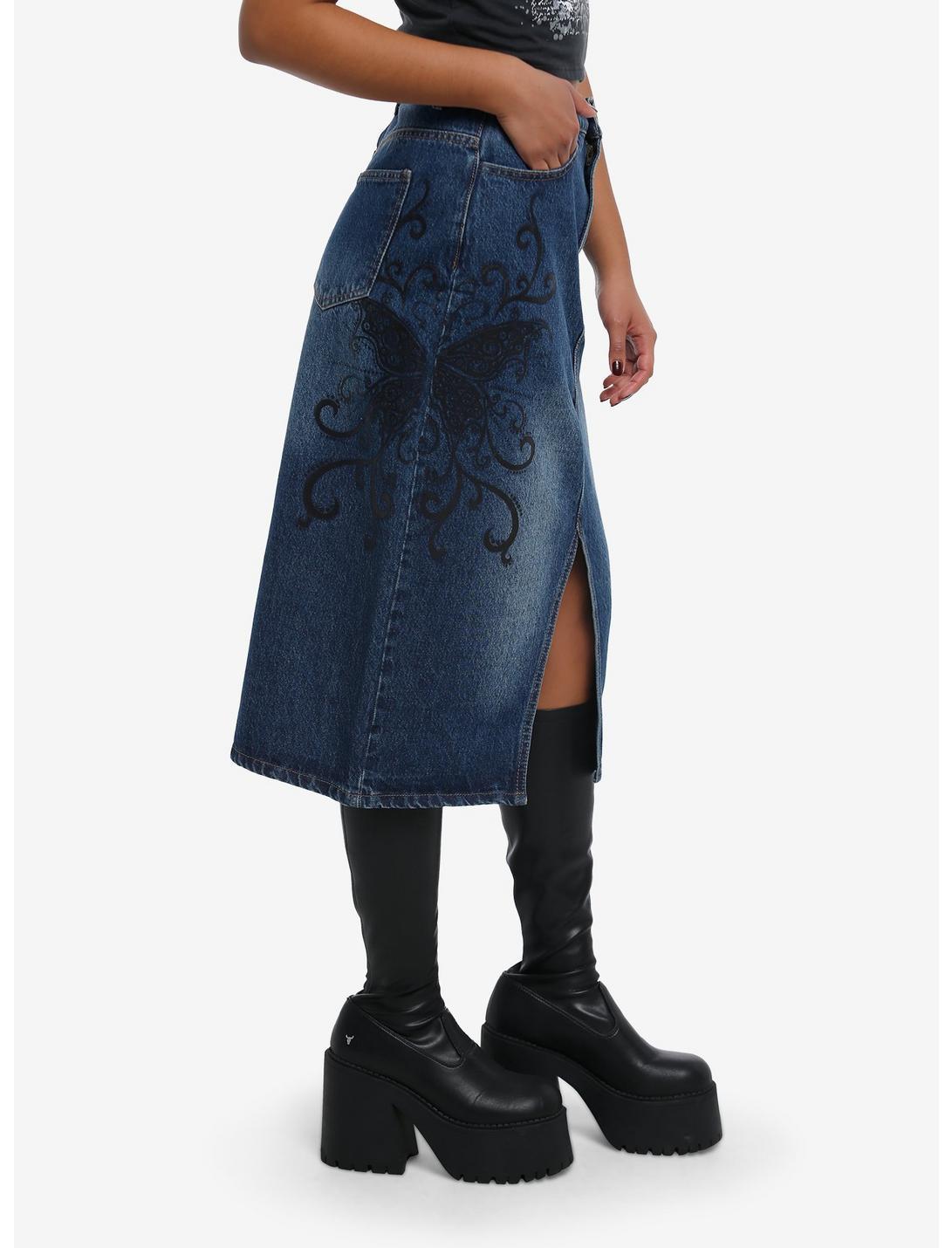 We're all aflutter for this trendy denim skirt! It has filigree and butterfly details down one hip and a central slit on the front for mobility. Comes with front and back pockets.Please note: Skirt is fitted with no stretch; size up for a looser fit.95% polyester; 5% spandexWash cold; dry flatLength: 33"ImportedListed in junior sizesModel is 5'9"Model wears size Small