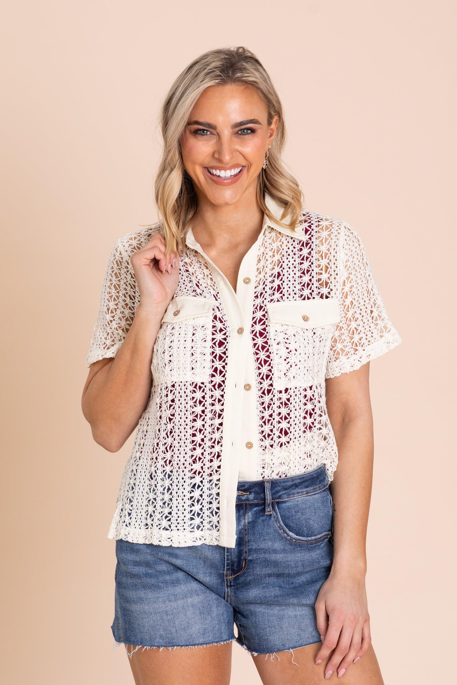 Product Details Colors: Black/ Ivory Print: Solid Crochet Neckline: Button Down Sleeve: Short Sleeve Hemline: Straight Brand: Staccato Material and Care Self: 80% Polyester 20% Cotton Contrast: 93% Polyester 7% Spandex Hand Wash Cold Hang/Line Dry Size and Fit Small: Bust 38" Waist 38" Length 23.5" Medium: Bust 40" Waist 40" Length 24" Large: Bust 42" Waist 42" Length 24.5" X Large: Bust 44" Waist 44" Length 25"