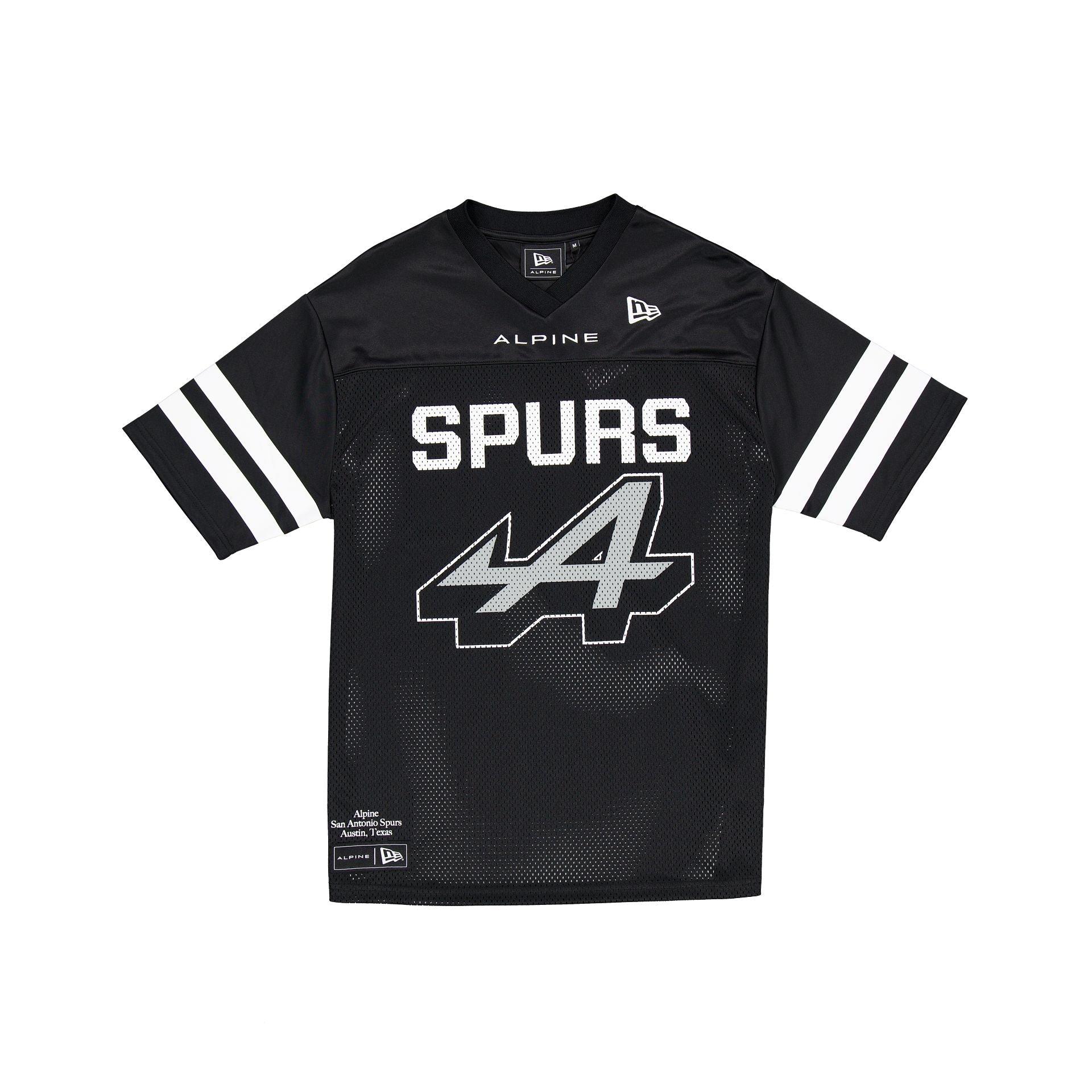 The BWT Alpine F1 Team x San Antonio Spurs Jersey features a screen-printed BWT Alpine F1 Team logo and Spurs wordmark with an embroidered Alpine wordmark and New Era Flag at the front. Additional Details include an Alpine San Antonio Spurs Austin, Texas wordmark above a woven Alpine x New Era tag at the hem with screen-printed stripe details at the sleeve.Fabric: 100% Polyester