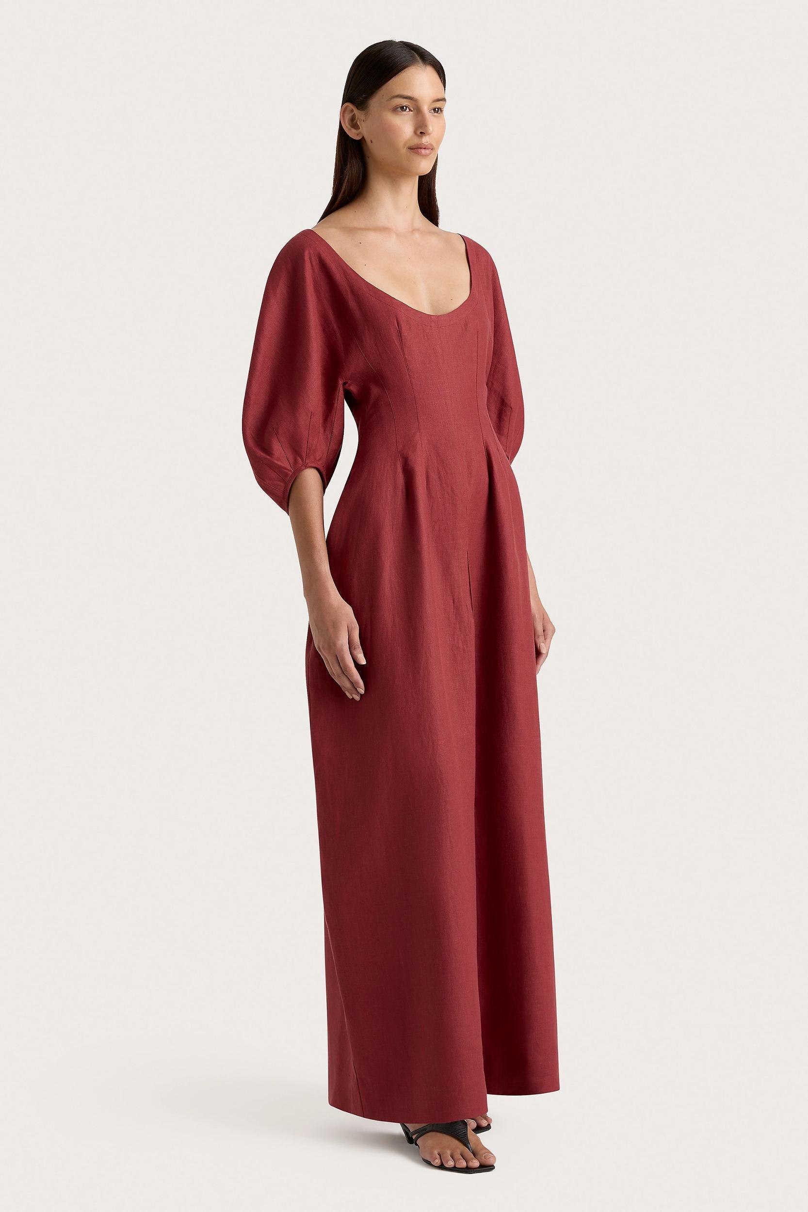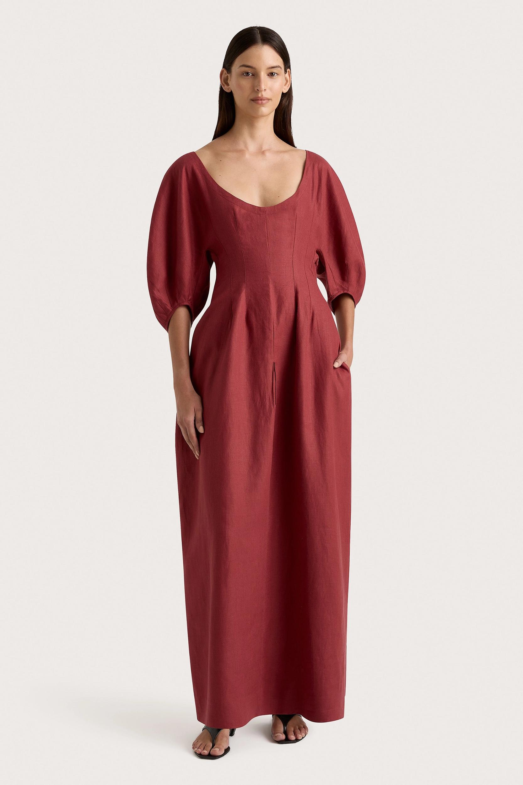 A transeasonal maxi dress with a low scooped neckline and oversized rounded sleeves that reach down to the elbow. Crafted from 100% Linen European Flax® linen in a rich red wine hue, it cinches in at the waist before falling into a lantern-style skirt. A longer iteration of the Raynara Mini Dress, style with a simple flat or kitten heel for refined yet relaxed year-round wear.