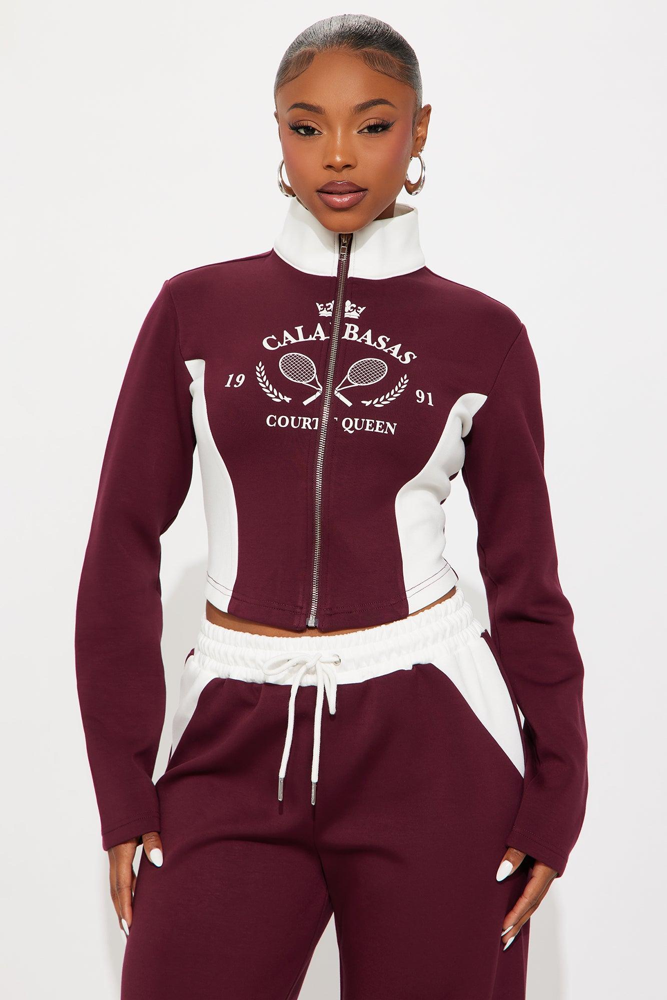 Available In Burgundy And Kelly Green. 2 Piece Ensemble Track Jacket And Pant Set Stretch Cropped Drawstring Waistband Disclaimer: Due To The Printing Process A Difference In Saturation May Occur. Each Garment Is Unique. 48% Polyester 44% Rayon 8% Spandex Imported California Proposition 65WARNING: Cancer and Reproductive Harm - www.P65Warnings.ca.gov.