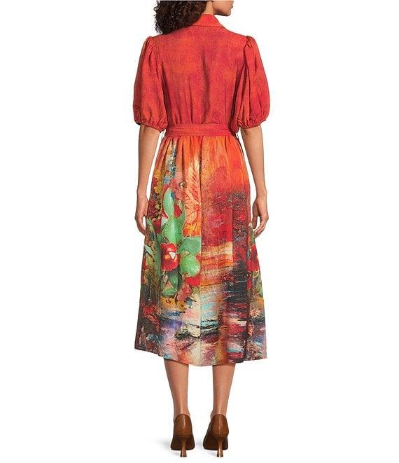 Calessa Border Fall Print Point Collar Short Sleeve Midi Shirt Dress