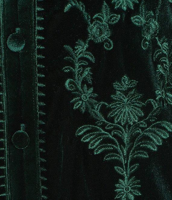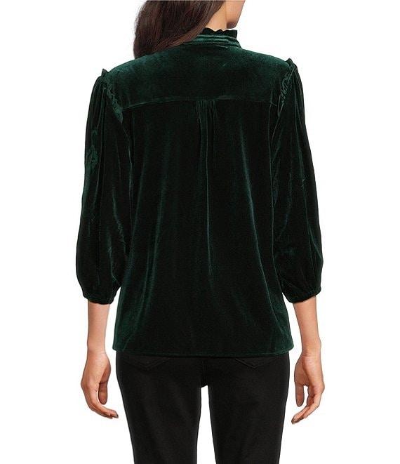 Calessa Embroidered Ruffle Split V-Neck 3/4 Sleeve Button Front Velvet Tunic
