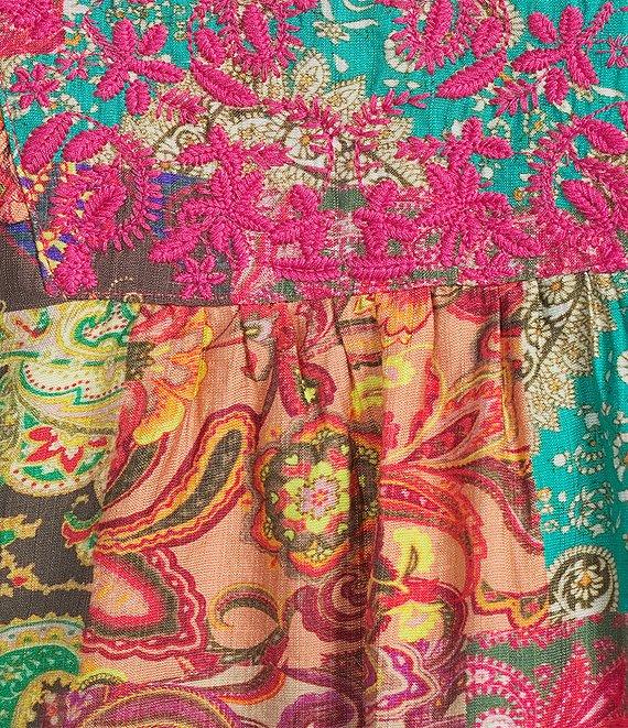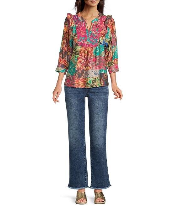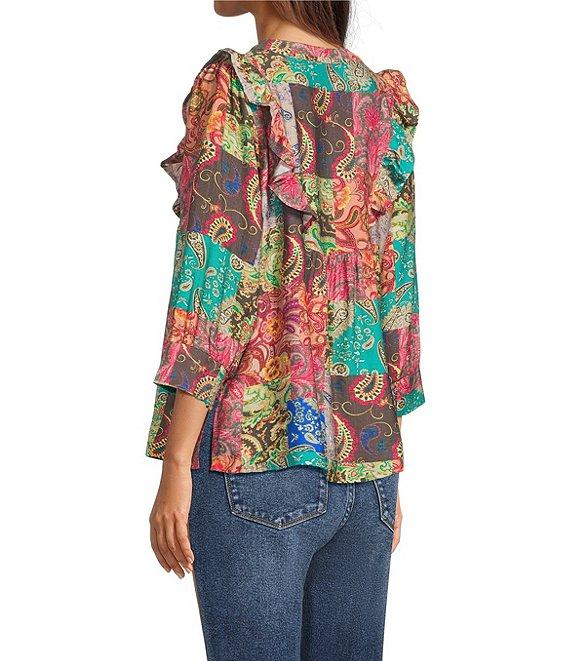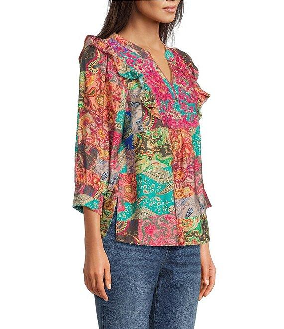 Calessa Italian Patchwork Floral Split V-Neck Ruffle 3/4 Sleeve Top
