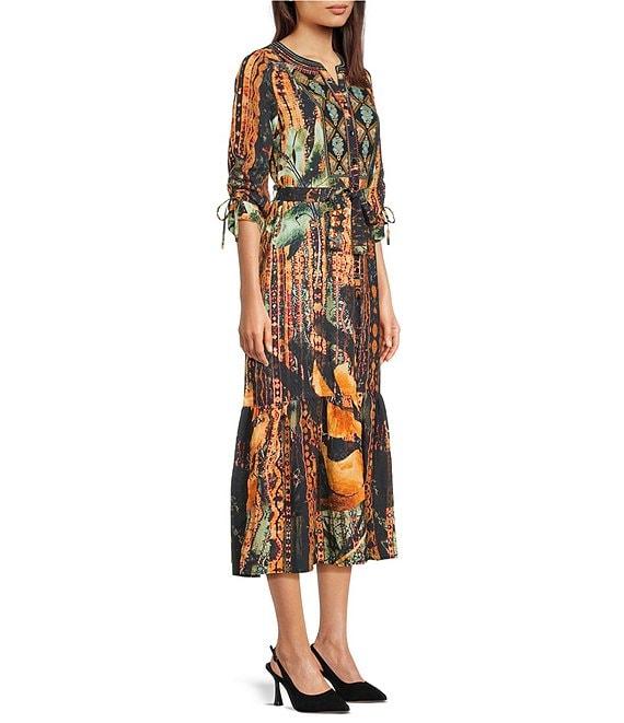 From Calessa Petite, this dress features: Woven fabrication A-line silhouette Banded v-neckline 3/4 sleeves Abstract mosaic print Embroidered bib Self-tie sash Tiered skirt Straight hemline Button front closure Approx. 48" length Polyester Hand wash/line dry Imported.