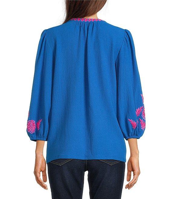 Calessa Petite Size Crinkle Textured Embroidered Patchwork Round Split V-Neck Bracelet Sleeve Tunic