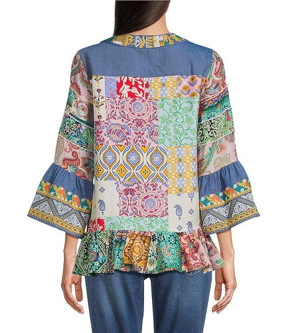 Calessa Petite Size Embroidered Patchwork Split V-Neck 3/4 Sleeve Tunic