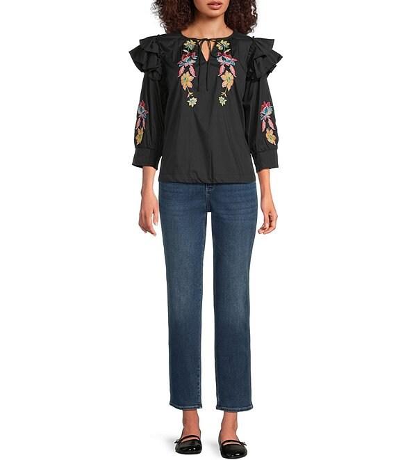 Calessa Embroidered Split Ruffle V-Neck Shoulder 3/4 Sleeve Button Front Tunic