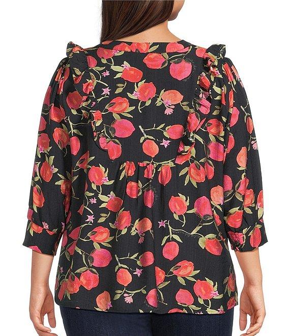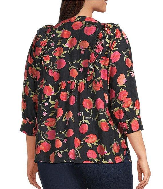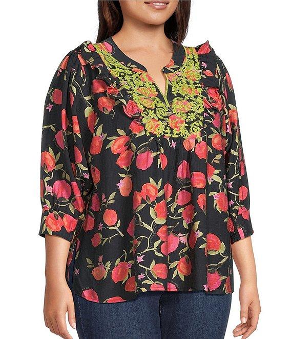 Calessa Plus Size Embroidered Floral Round Split V-Neck 3/4 Sleeve Tunic