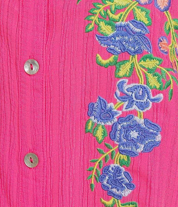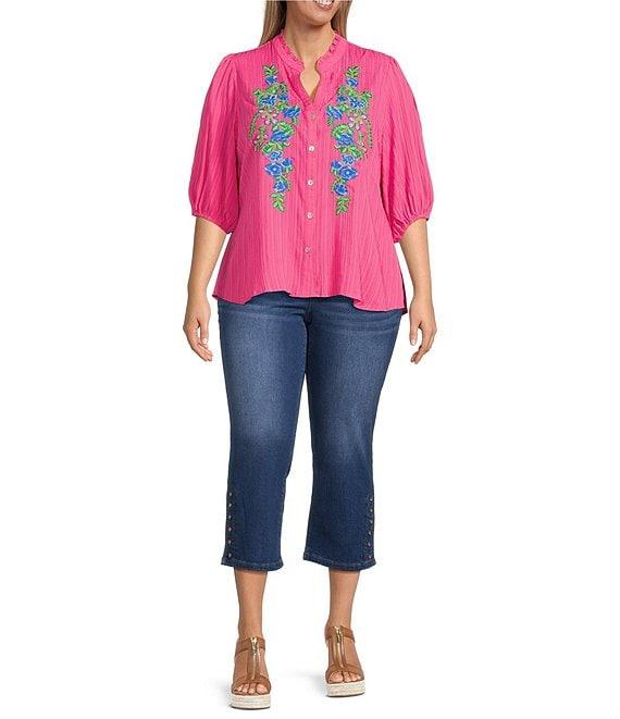 Calessa Plus Size Embroidered Split V-Neck 3/4 Sleeve Shirttail Hem Button Front Tunic