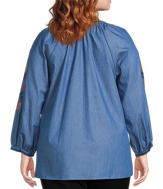 Calessa Plus Size Embroidered Tassel Tie Round Split Neck Long Sleeve Tunic