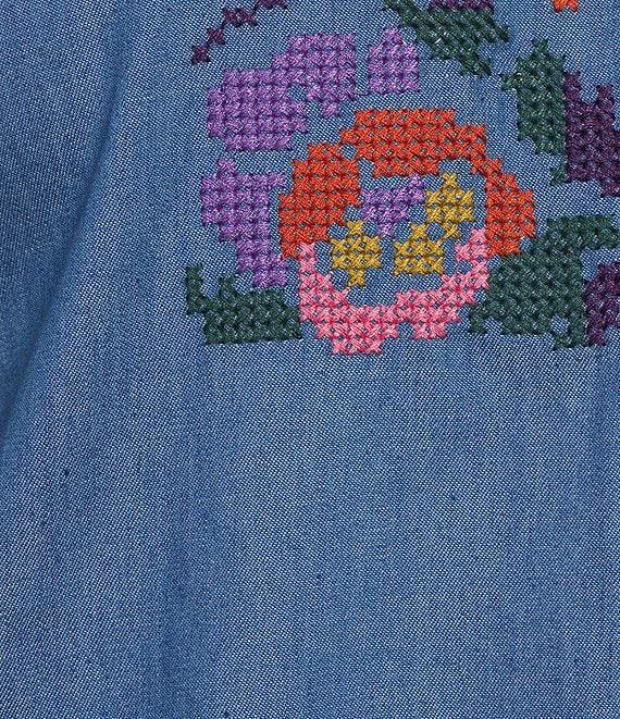 From Calessa Plus, this tunic features: Round split neckline with tassel ties Long sleeves Floral embroidered details Straight hemline Pullover construction Approx. 30" length Polyester Hand wash cold/line dry Imported.