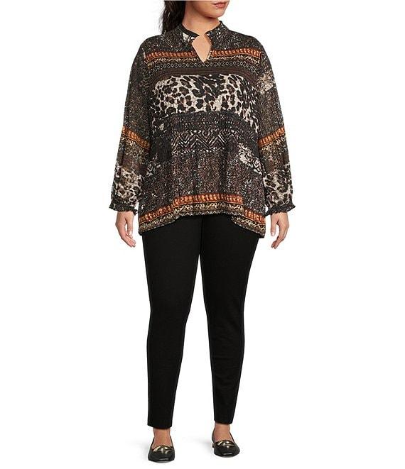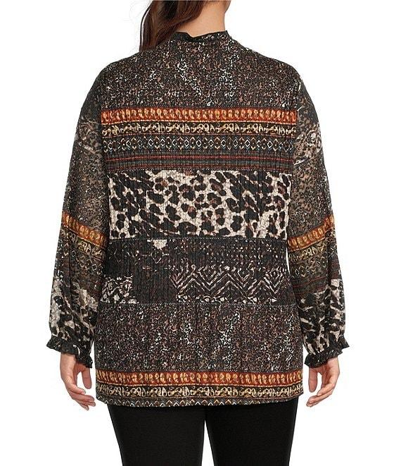 Calessa Plus Size Mesh Animal Border Print Split V-Neck Long Sleeve Tunic