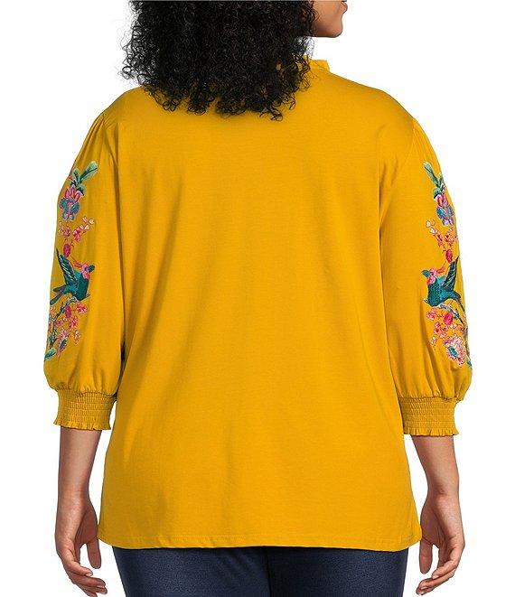 Calessa Plus Size Split Ruffle V-Neck 3/4 Floral Embroidered Balloon Sleeve Tunic
