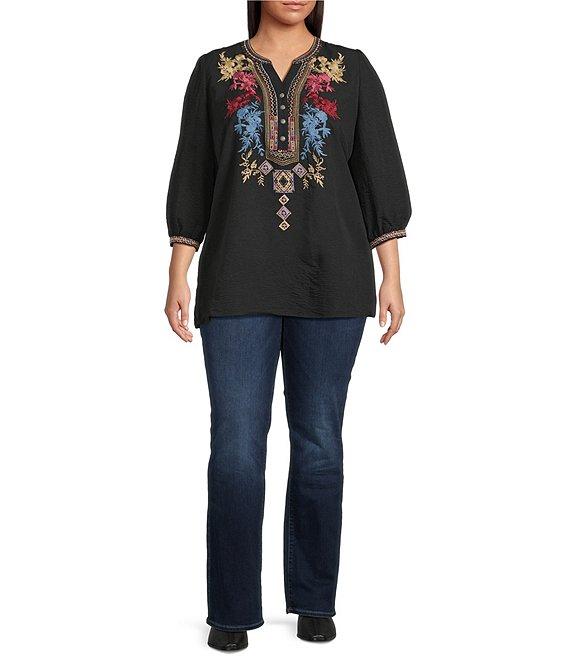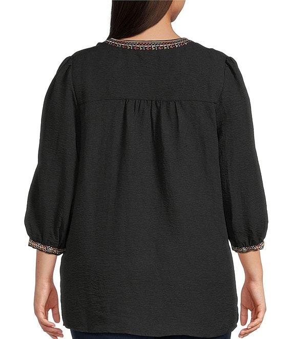 Calessa Plus Size Woven Embroidered Split V-Neck 3/4 Sleeve Tunic