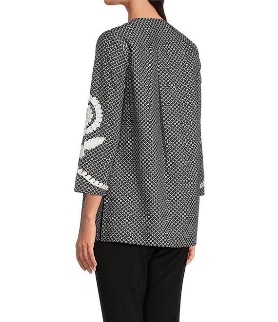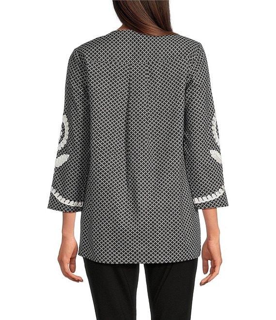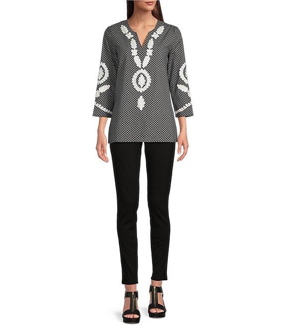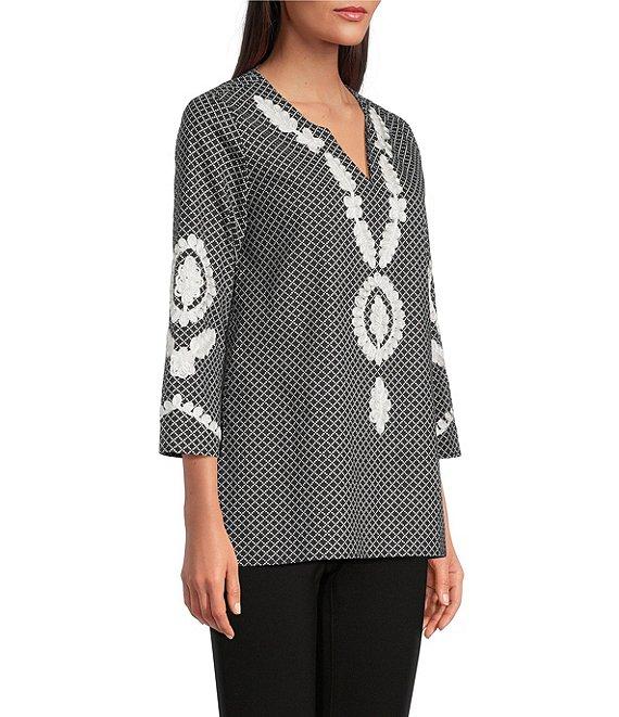 Calessa Soutache Embroidered Geometric Print Split V-Neck 3/4 Sleeve Tunic