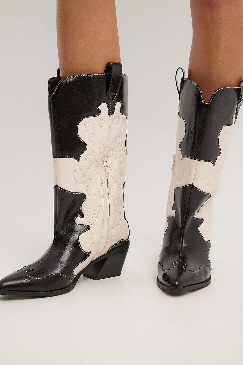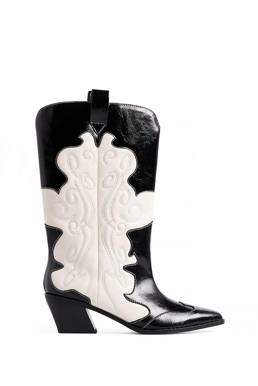 These boots are calf high and western style and feature a glossy design and a pointed toe. They have a wide shaft and a tilted block heel. Our boots feature a subtle side zipper closure on the side. Measurements in size EU 39: Heel height: 6.5 cm / 2.56 in. Shaft height: 30 cm / 11.81 in. Shaft circumference around the calf: 40 cm / 15.75 in.