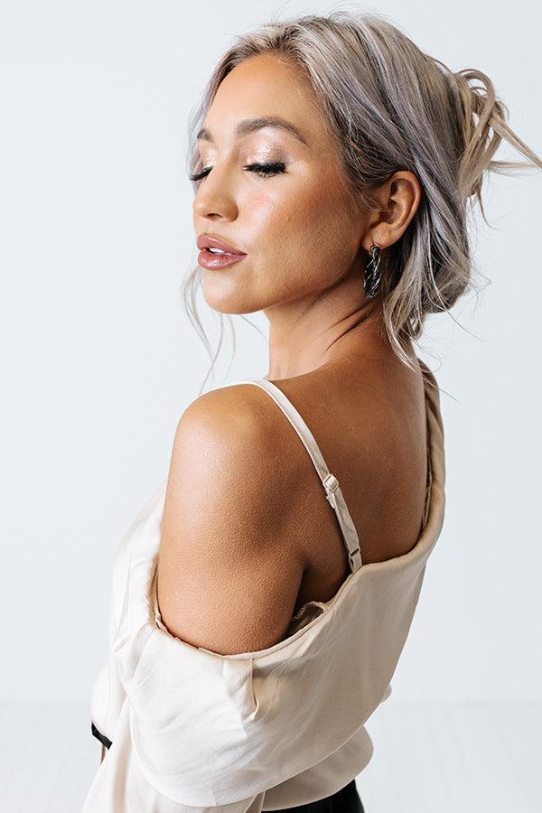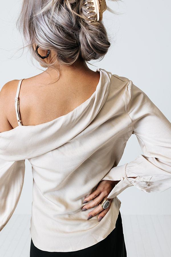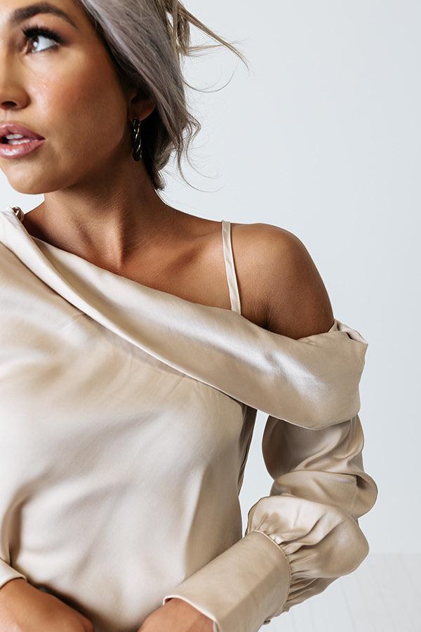 Call the paparazzi because we guarantee you'll want to be photographed in this pretty champagne colored top featuring lightweight material, a diagonal neckline with a single adjustable spaghetti strap and a rolled collar, long loose sleeves with split cuffs, and a relaxed silhouette that falls into a straight hemline! Measurements S : Bust 32", Hip 33", Length 23.5", Sleeve Length 23.5", Waist 32". M : Bust 34", Hip 35", Length 24", Sleeve Length 24", Waist 34". L : Bust 36", Hip 37", Length 24", Sleeve Length 24.5", Waist 36".