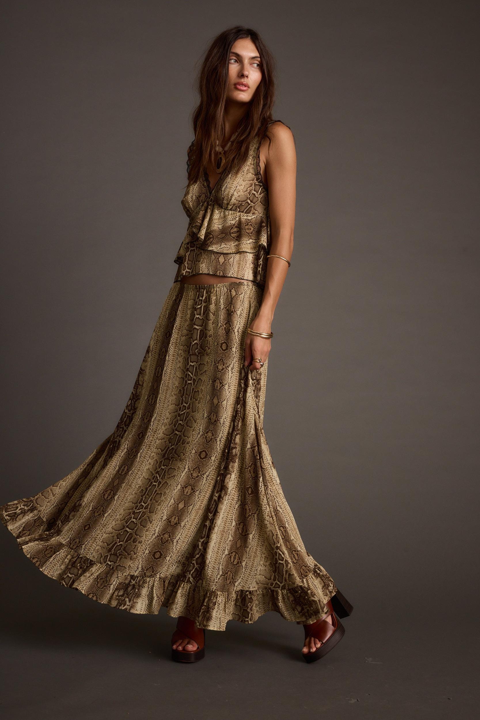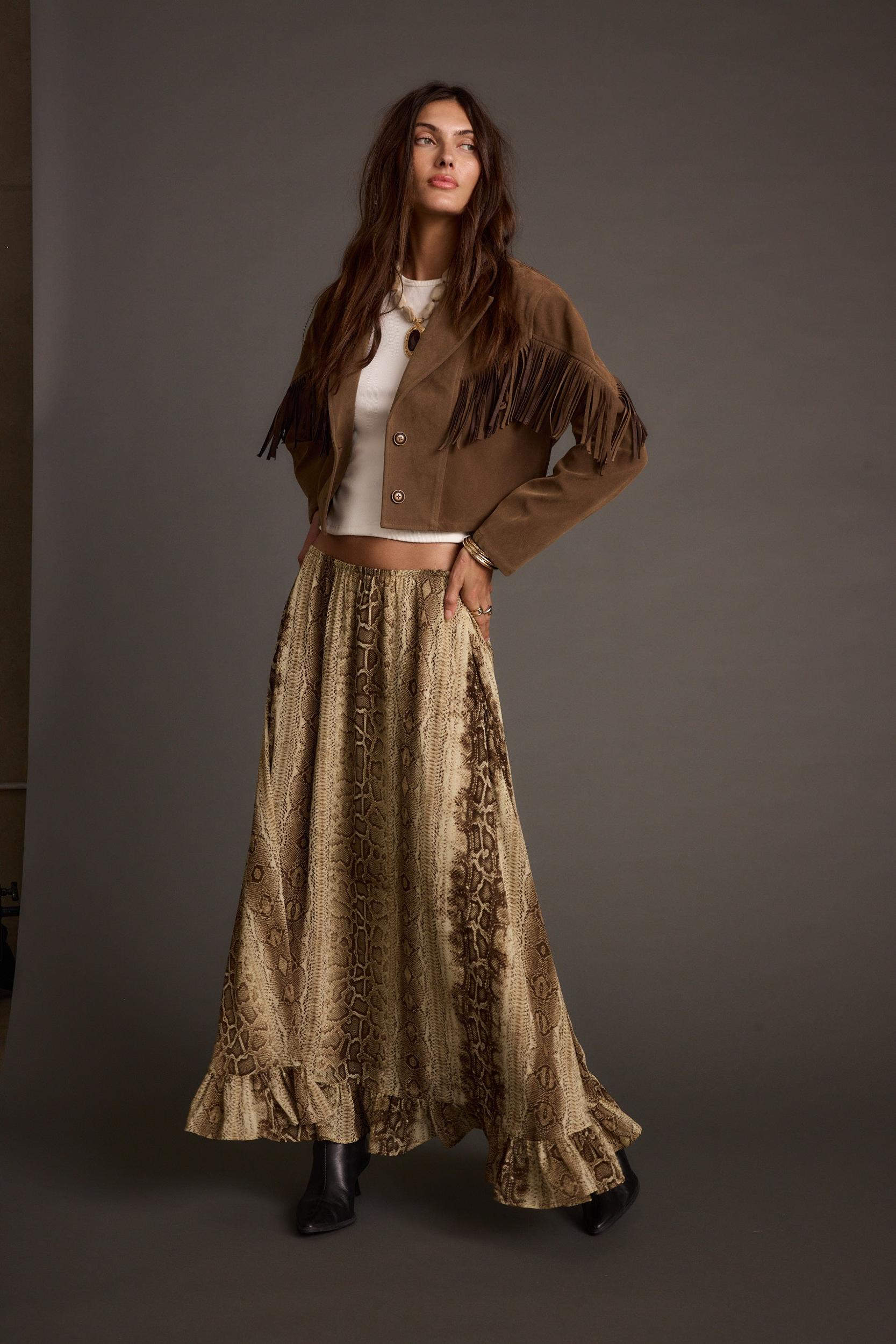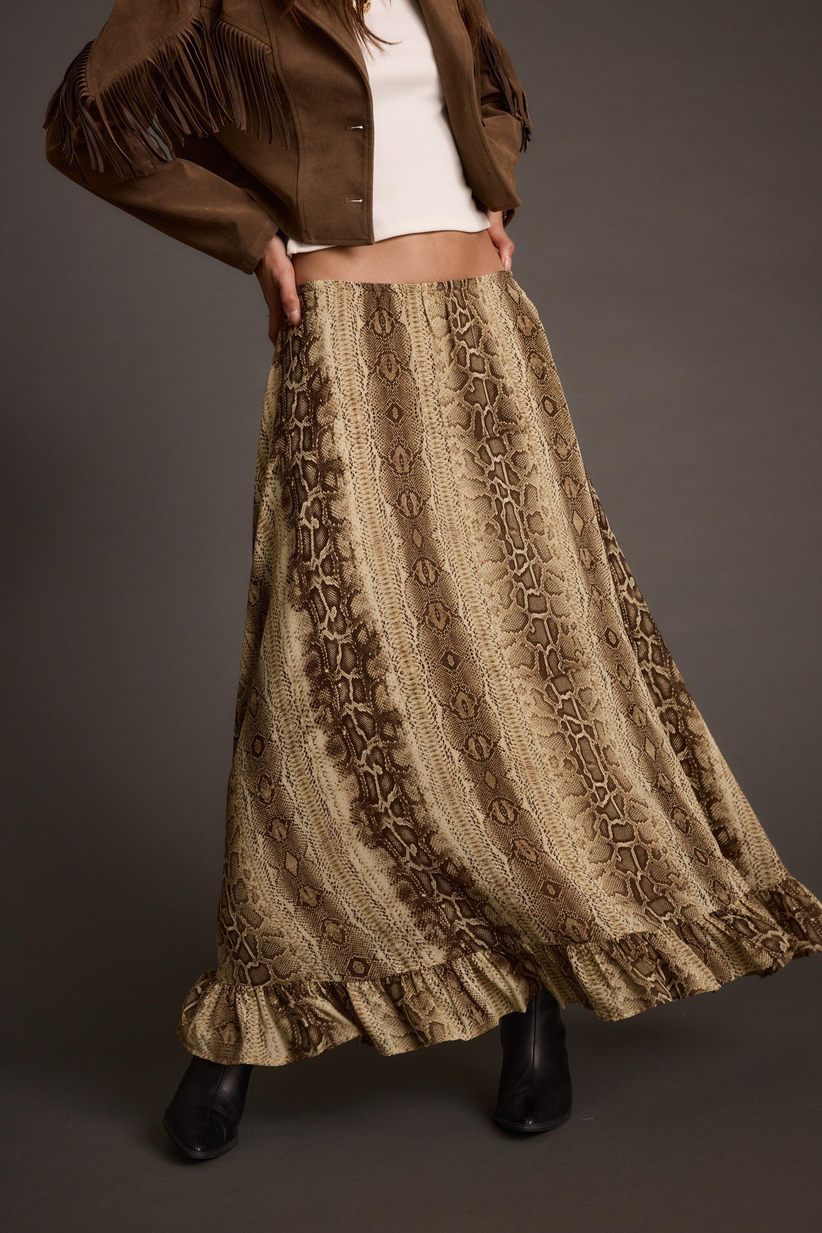 Your fall wardrobe just got a plot twist. The Calla Snake Print Maxi Skirt sways in lightweight chiffon with a ruffled hem and A-line silhouette, perfect for layering with sweaters or statement boots. Wear it mid-to-low rise, easy to wear for any occasion.