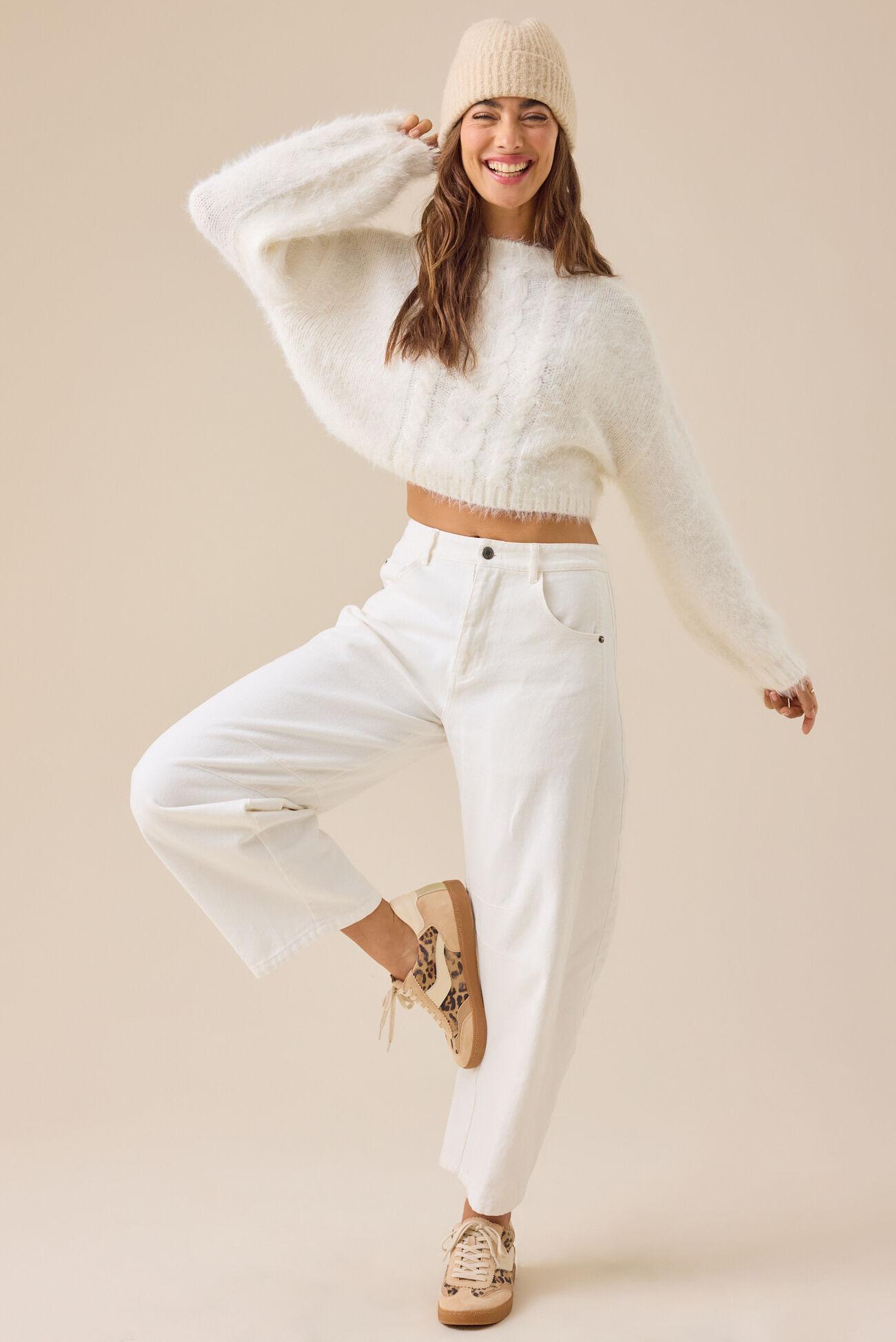 This fuzzy cropped sweater is as soft as a cloud and perfect for adding a pop of color to any outfit. Its playful cropped length makes it ideal for pairing with high-waisted jeans or skirts.
