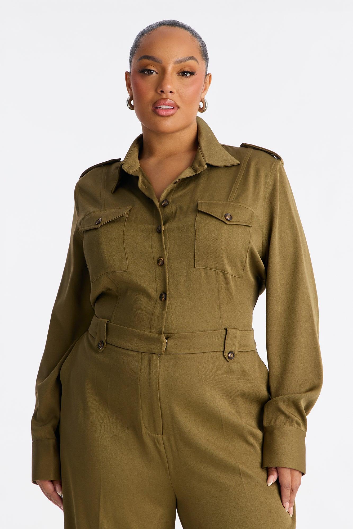 Available In Olive. Jumpsuit Non-stretch Collar Neck Button Front Closure Wide Leg Front Clasp And Zipper Closure Pockets 35" Inseam Self : 95% Polyester 5% Spandex Imported