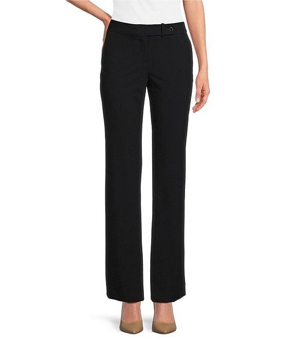 From Calvin Klein, these pants feature: luxe stretch seasonless fabrication flat front silhouette relaxed fit through hip and thigh wide waistband sits below the waist straight leg with slight flare bottom functional front and back pockets side seam pockets zipper fly with side button-tab closure; belt loops approx. 32.5" inseam; 9.5" front rise; 14" back rise polyester/rayon/spandex dry clean Imported.