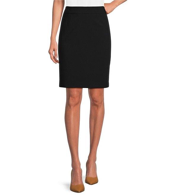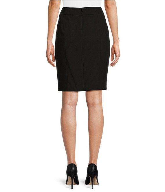 From Calvin Klein Petite, this pencil skirt features: luxe stretch fabrication Pencil silhouette wide, contoured waistband coin pocket below waistband darts at waist back vent concealed center back zipper closure approx. 21" from top of waistband length fully lined polyester/rayon/spandex dry clean Imported.