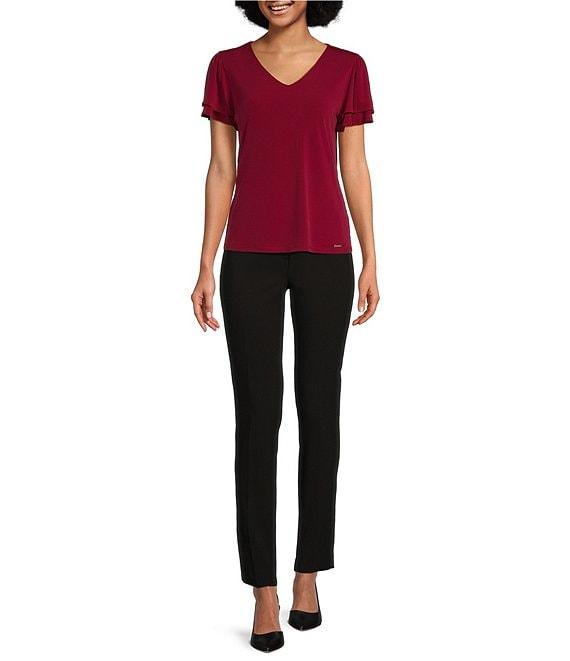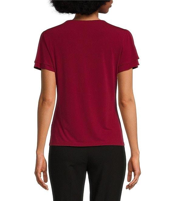 From Calvin Klein Petite, this top features: Matte jersey knit fabrication V-neckline Short double tier sleeves Straight hemline Pullover construction Approx. 22.5" length Polyester/spandex Dry clean Imported.