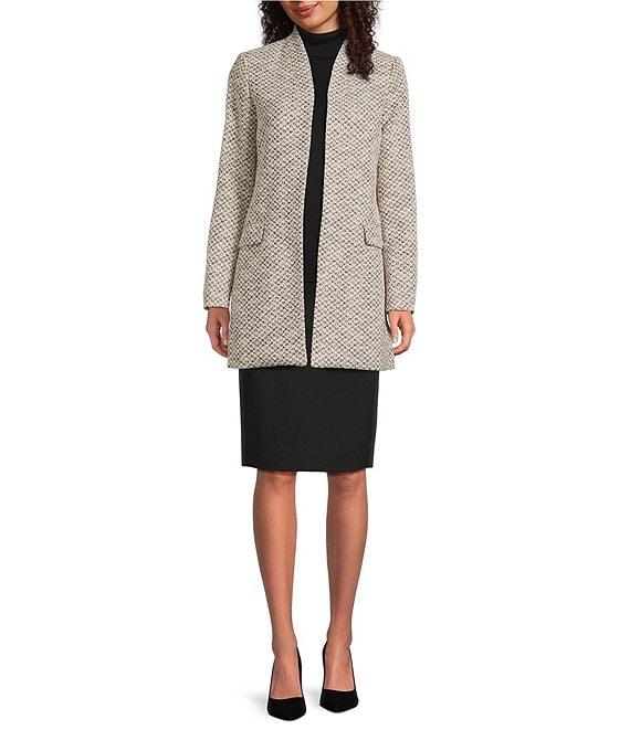 From Calvin Klein, this topper features: Knit tweed fabrication Collarless Long sleeves Side front flap pockets Lined Open front/no closure Approx. 32.5" length Polyester/cotton; lining: polyester Dry clean Imported.