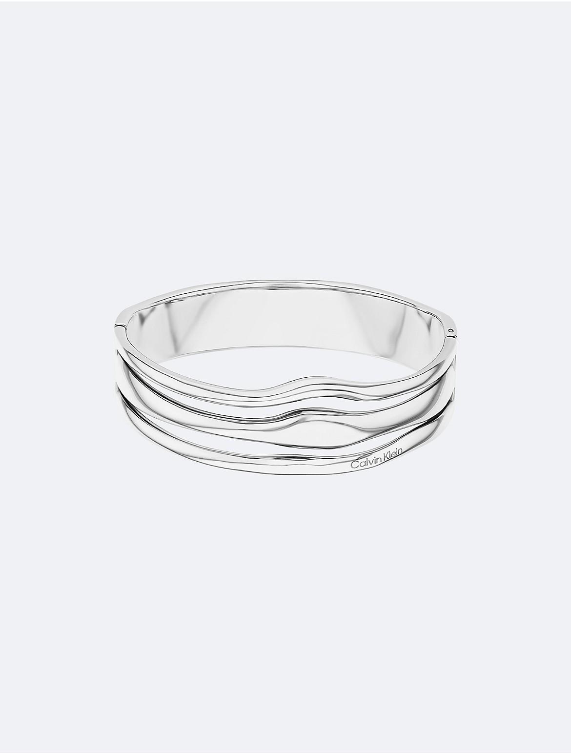 Sculptural layered shape in polished stainless steel. This bangle has a hinge closure and is finished with an engraved Calvin Klein logo. Material: 6.8.