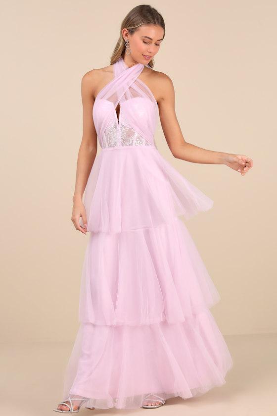 You'll be the definition of fun and flirty in an exceptional look like the Lulus Camie Light Pink Tulle Sequin Bustier Maxi Dress! Tulle-mesh fabric creates a tying halter-style neckline and a crisscrossing overlay atop a bustier-inspired bodice, featuring shiny clear sequins, sheer lace paneling, supportive underwire cups, and structured boning. The high, fitted waist tops a flouncy, tiered A-line skirt that cascades down to a maxi hem. Hidden back zipper/clasp.