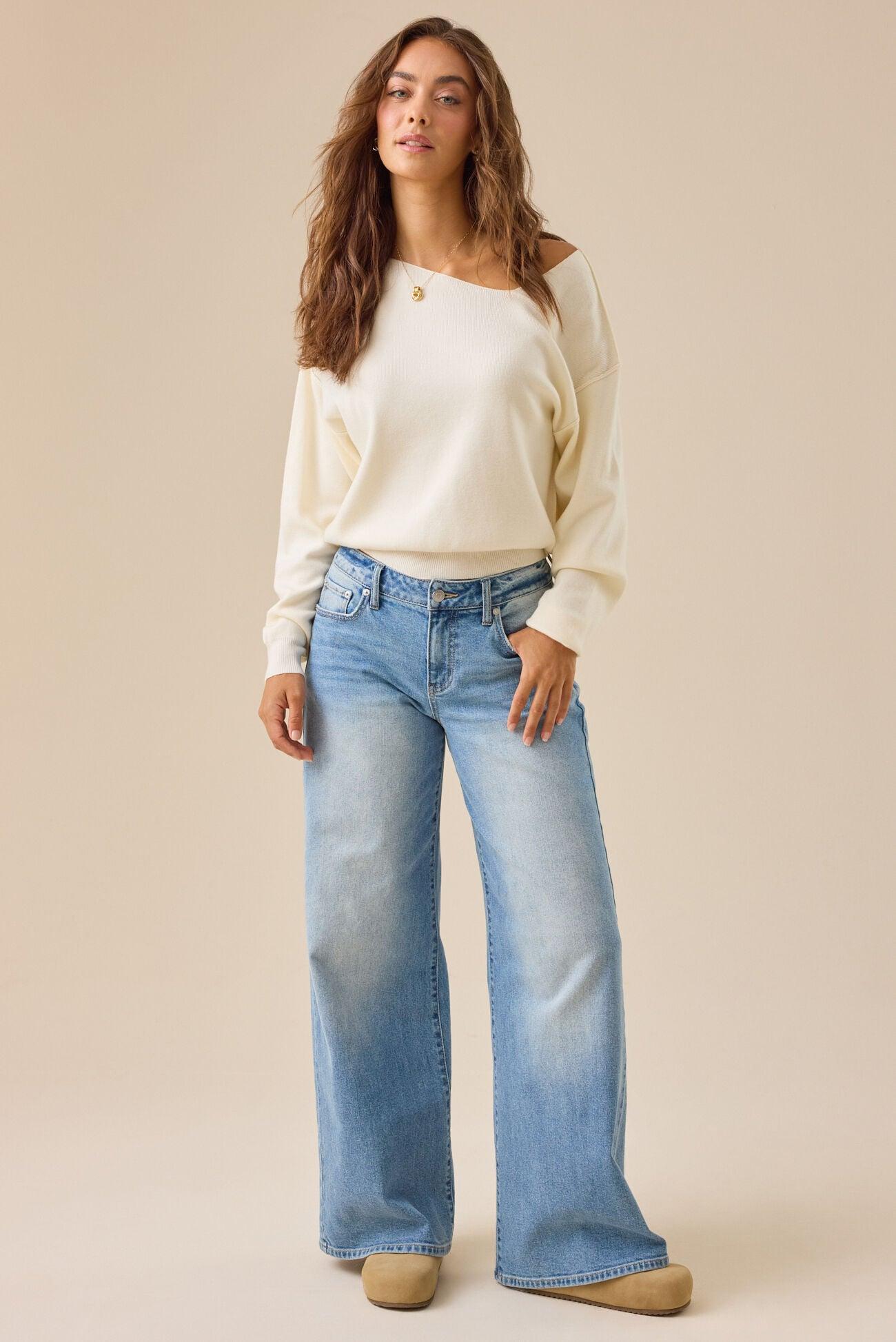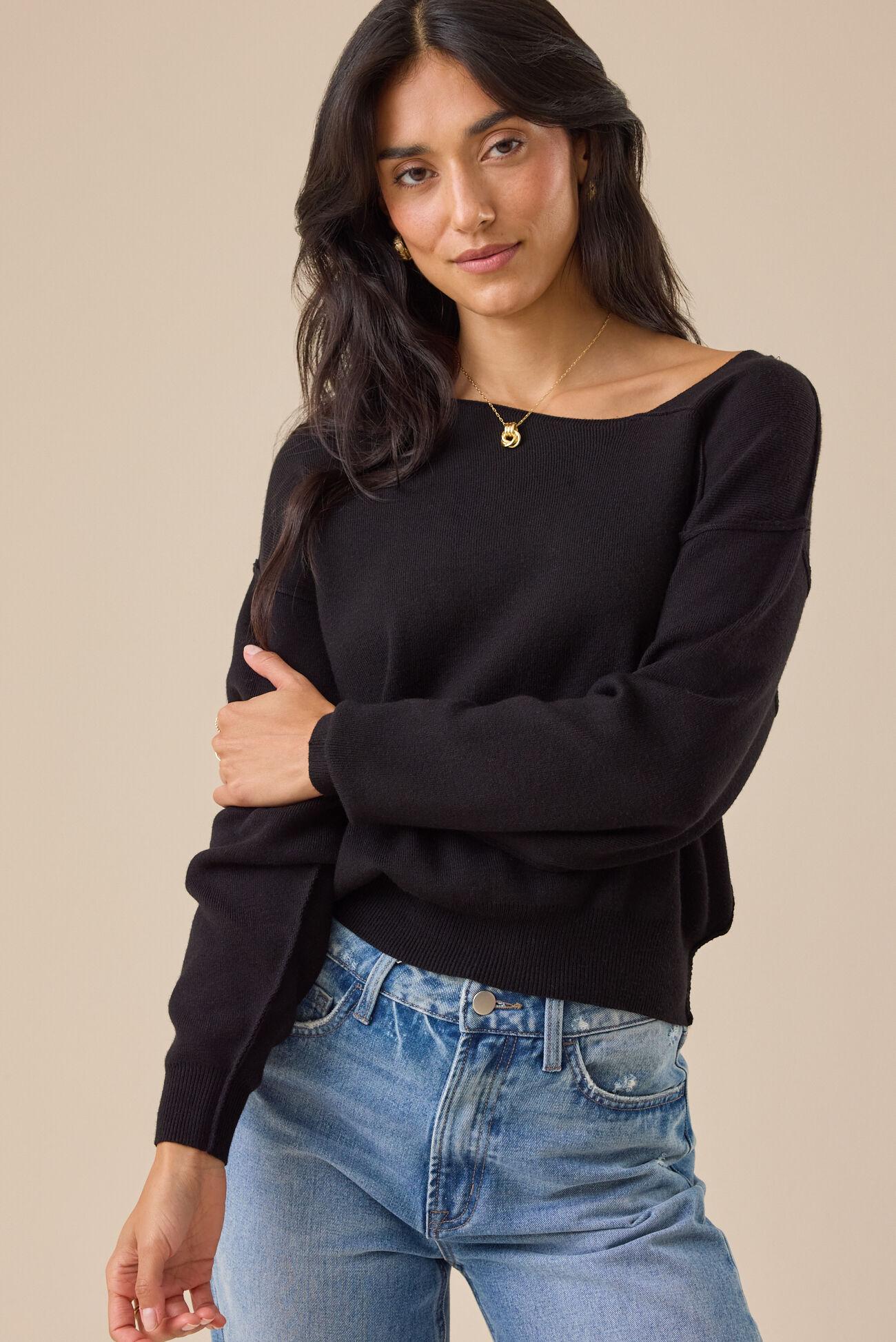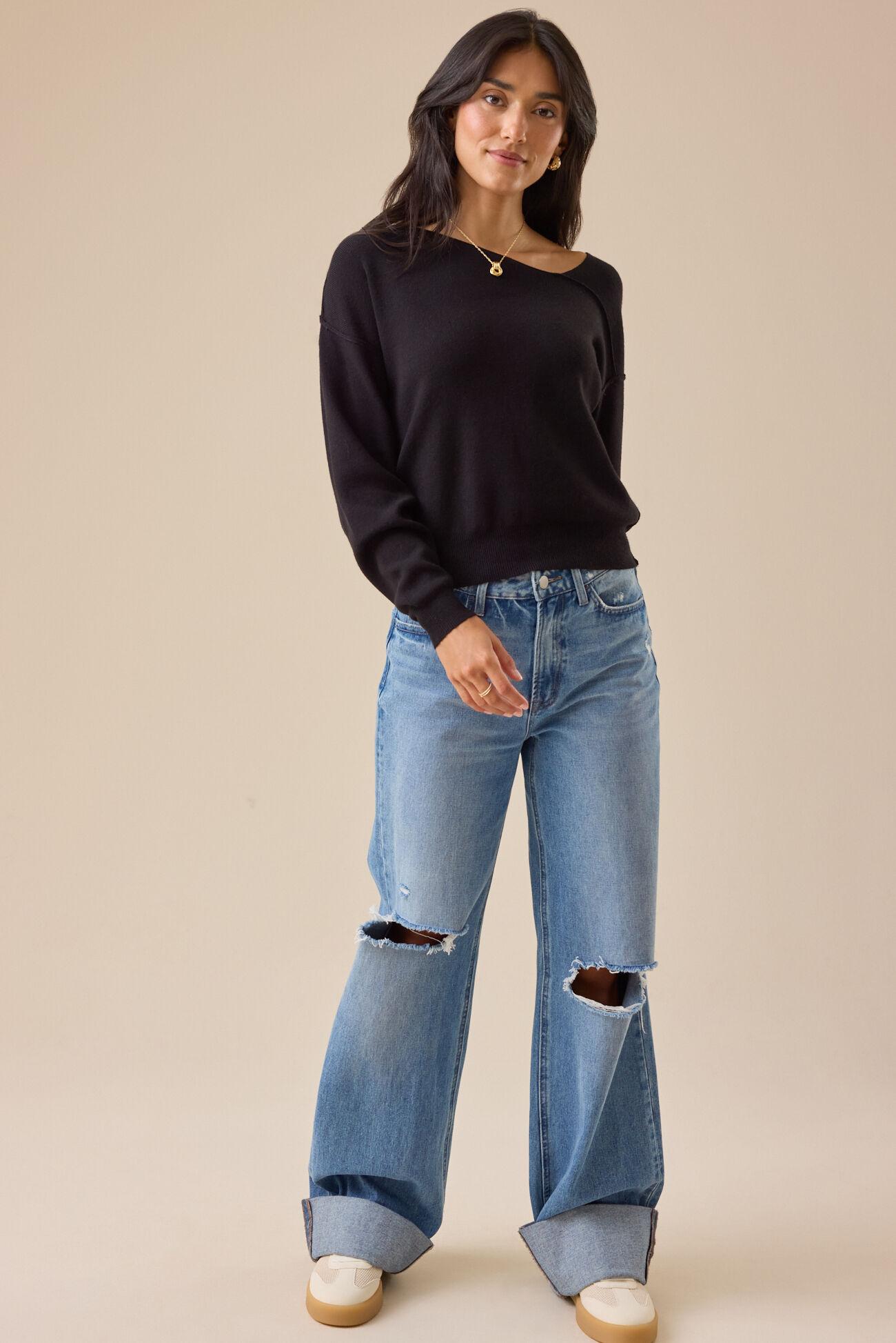 This sweater stands out with its distinctive asymmetrical neckline. The uneven design adds a touch of contemporary style and visual interest to the cozy knit, making it a fashionable and comfortable piece.