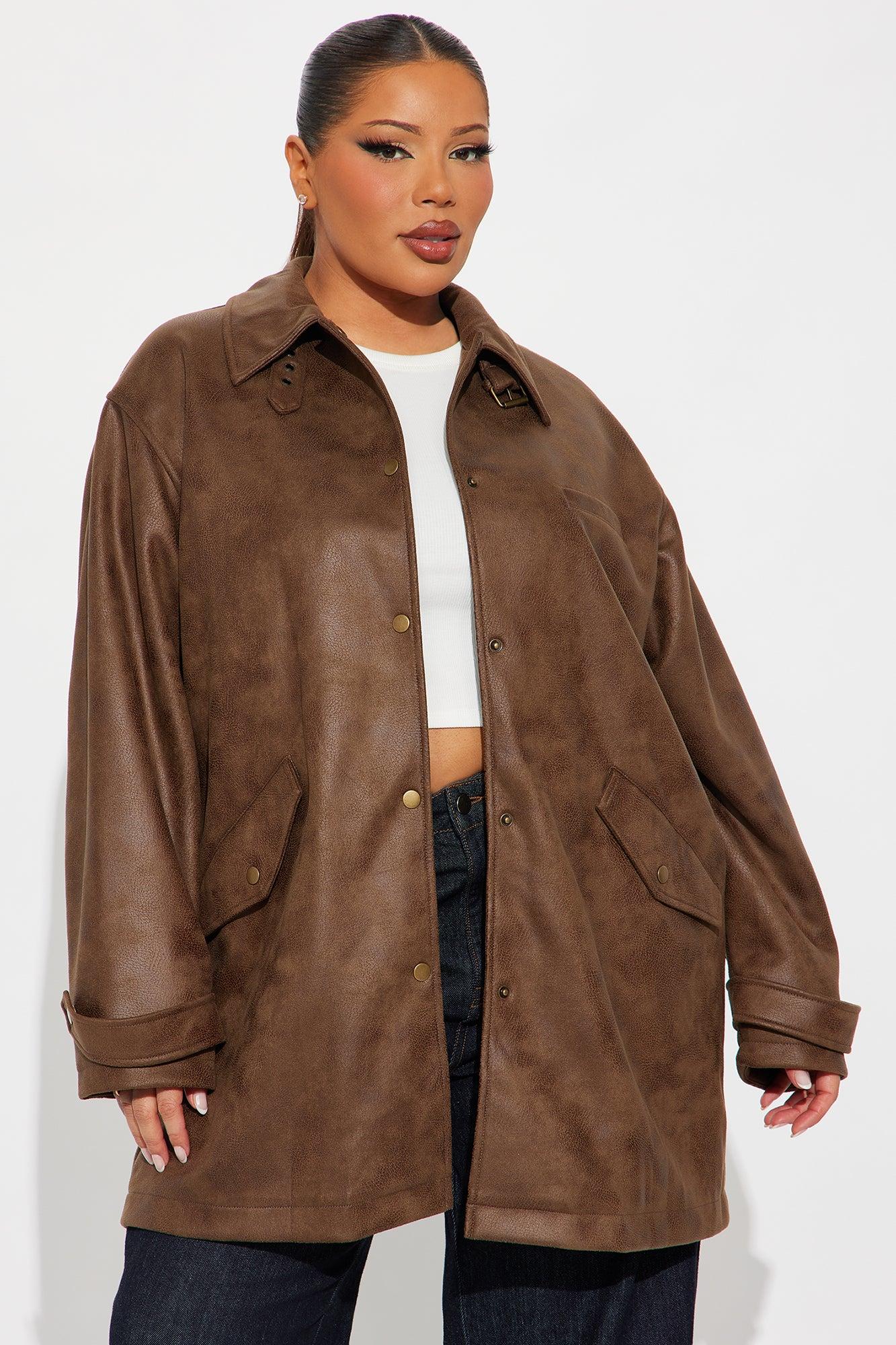 Available In Brown. Trench Coat Collar Long Sleeve Button Closure Fully Lined Faux Leather Shell: 93% Polyester 7% Spandex Lining: 100% Polyester Imported California Proposition 65WARNING: Cancer and Reproductive Harm - www.P65Warnings.ca.gov.