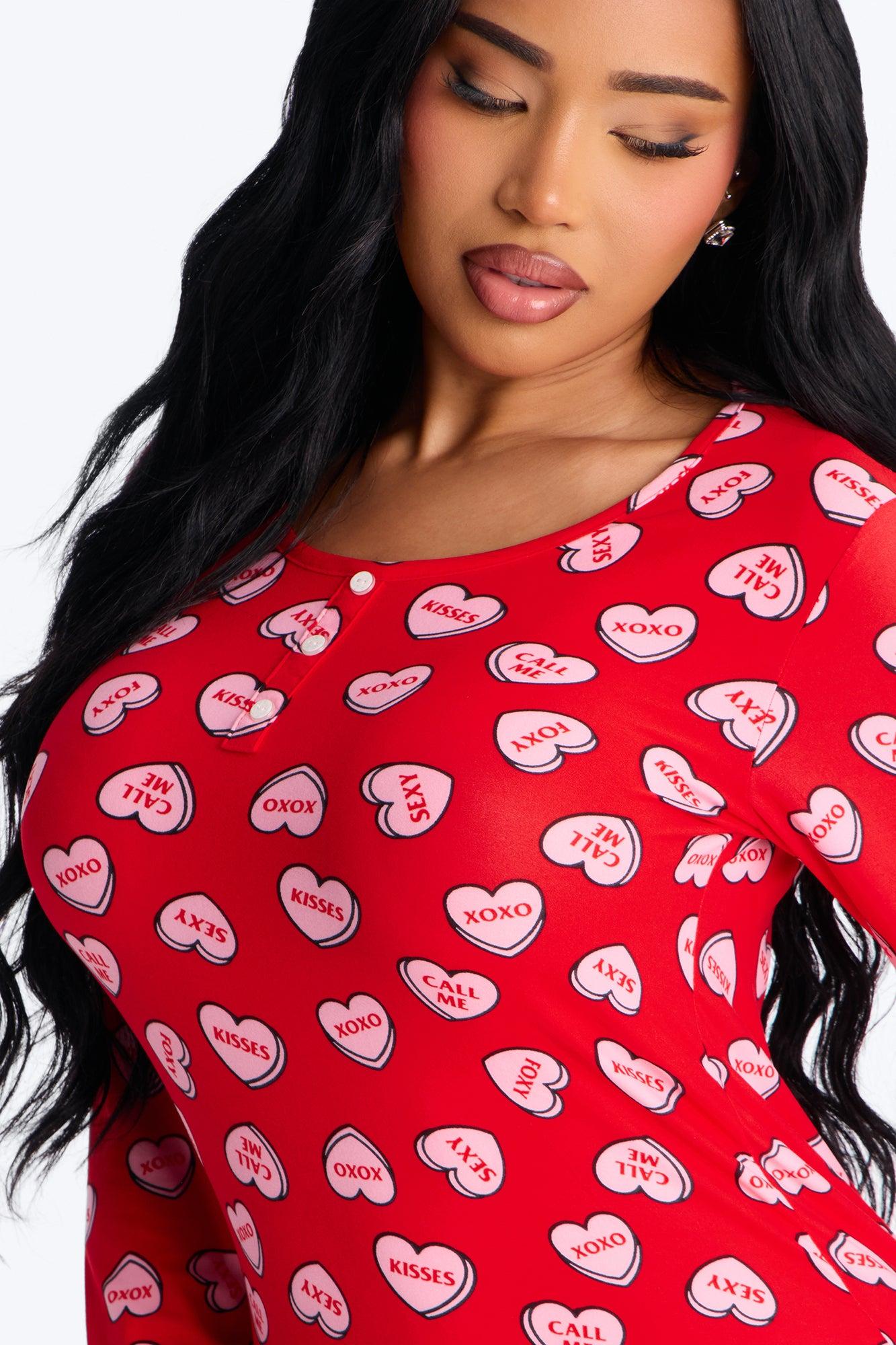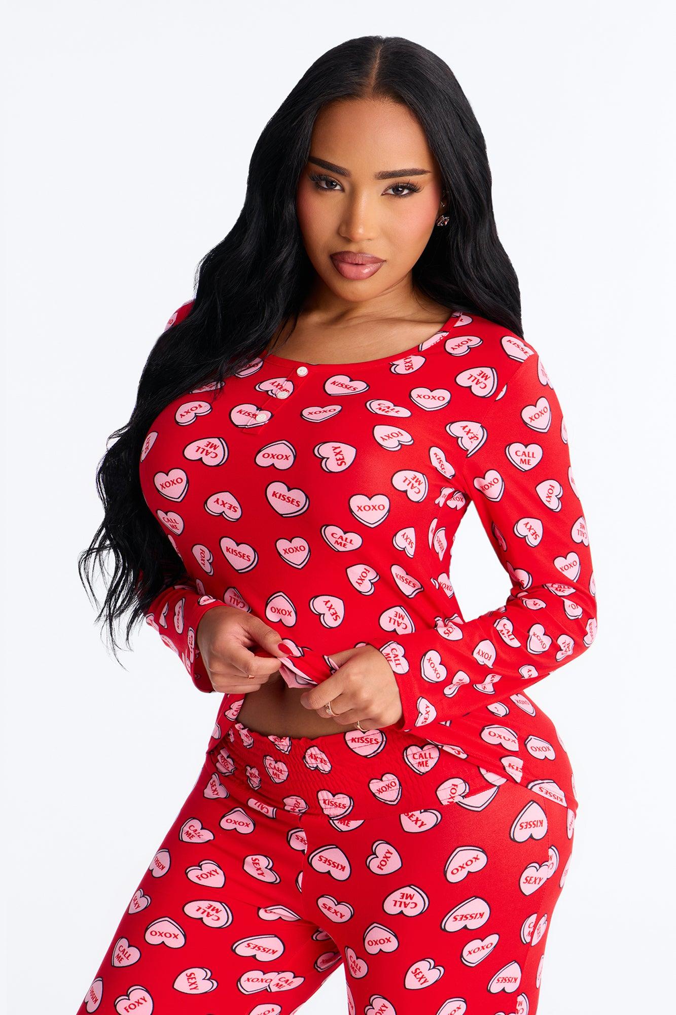 Available In Red/combo. PJ Pant Set Candy Heart Print Long Sleeve Button Detail Matching Bottoms Elastic Waistband Stretch Final Sale Self : 95% Polyester 5% Spandex Imported