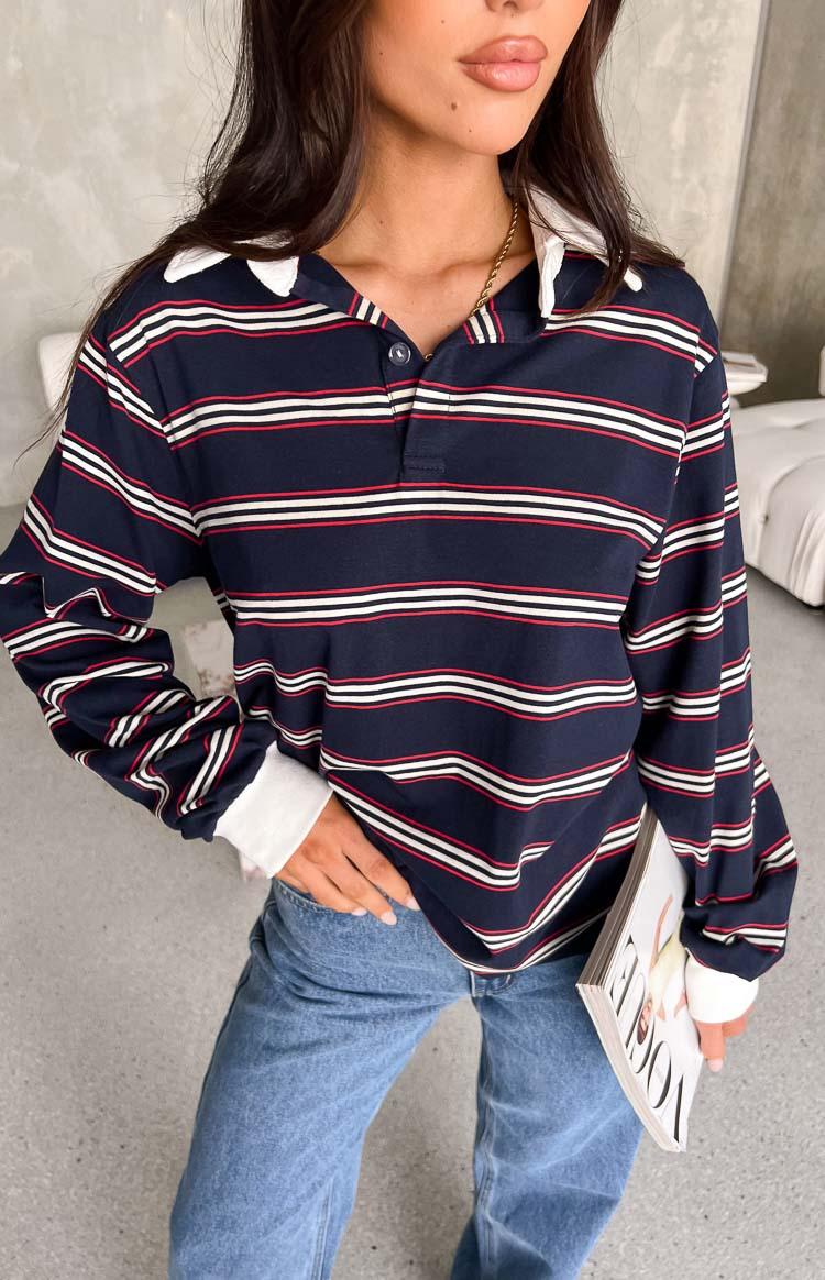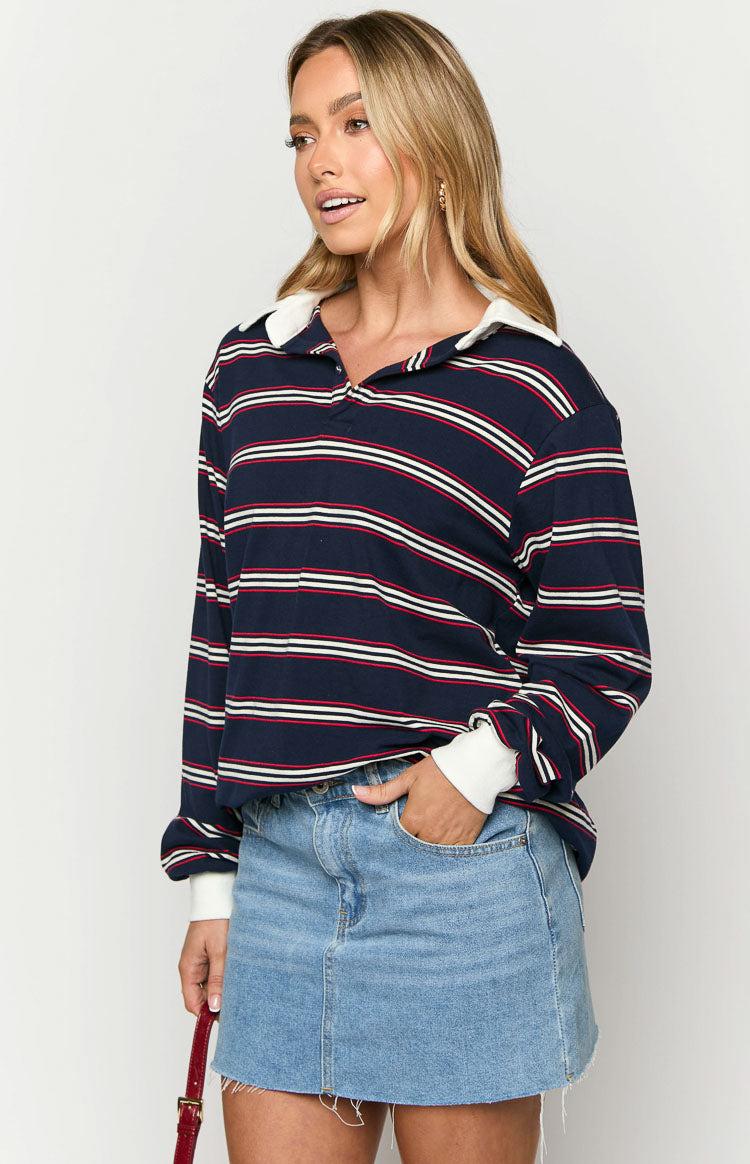 Navy Stripped JerseyHow to style:Look effortlessly stylish in the Carey Stripped Jersey. It's super easy to throw on with a pair of jeans and sneakers for the perfect streetwear look!Features: Loose fit Striped pattern Cuffed sleeves Collared Long length sleeve Unlined Lightweight jersey material Slight stretch