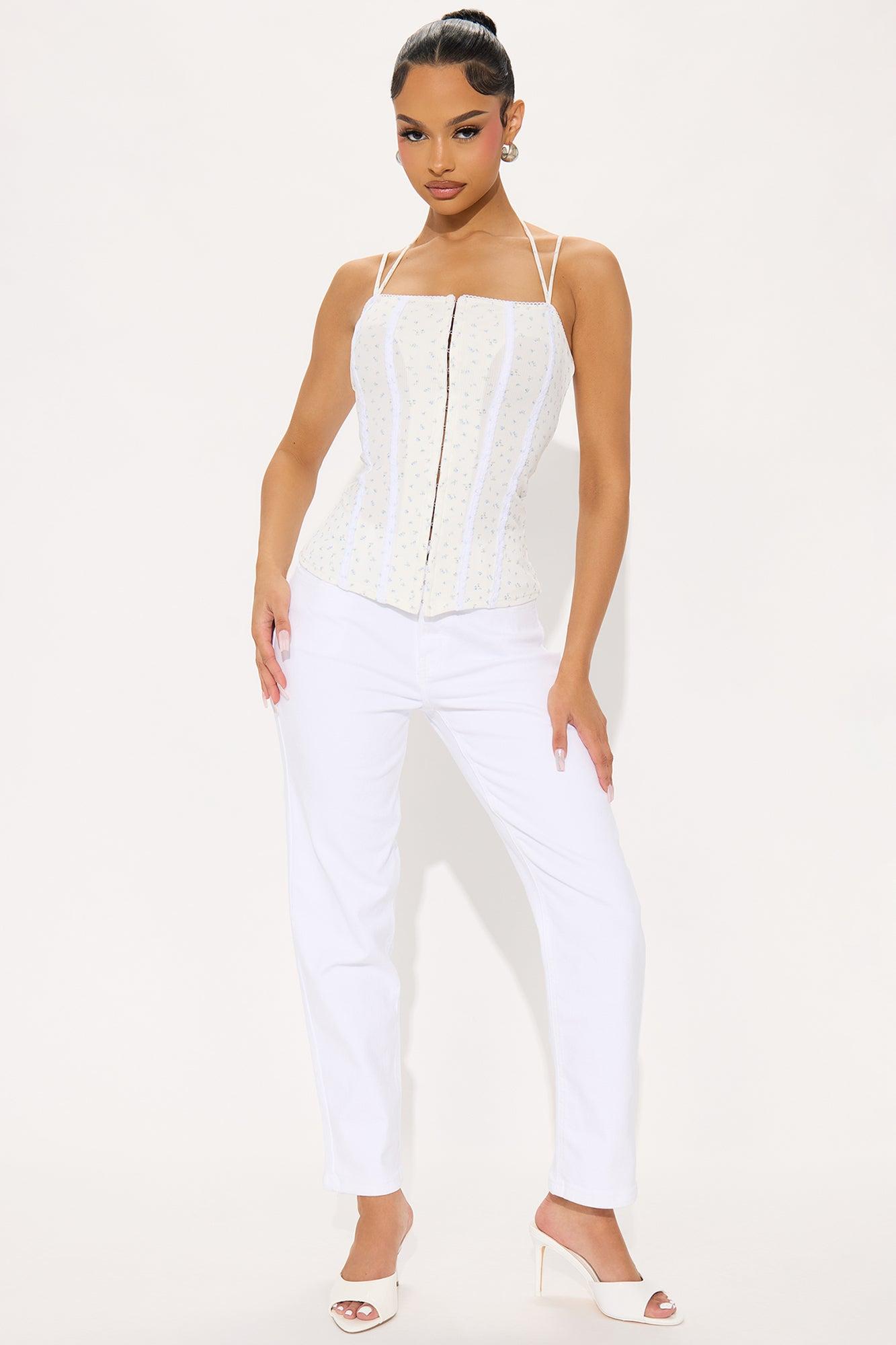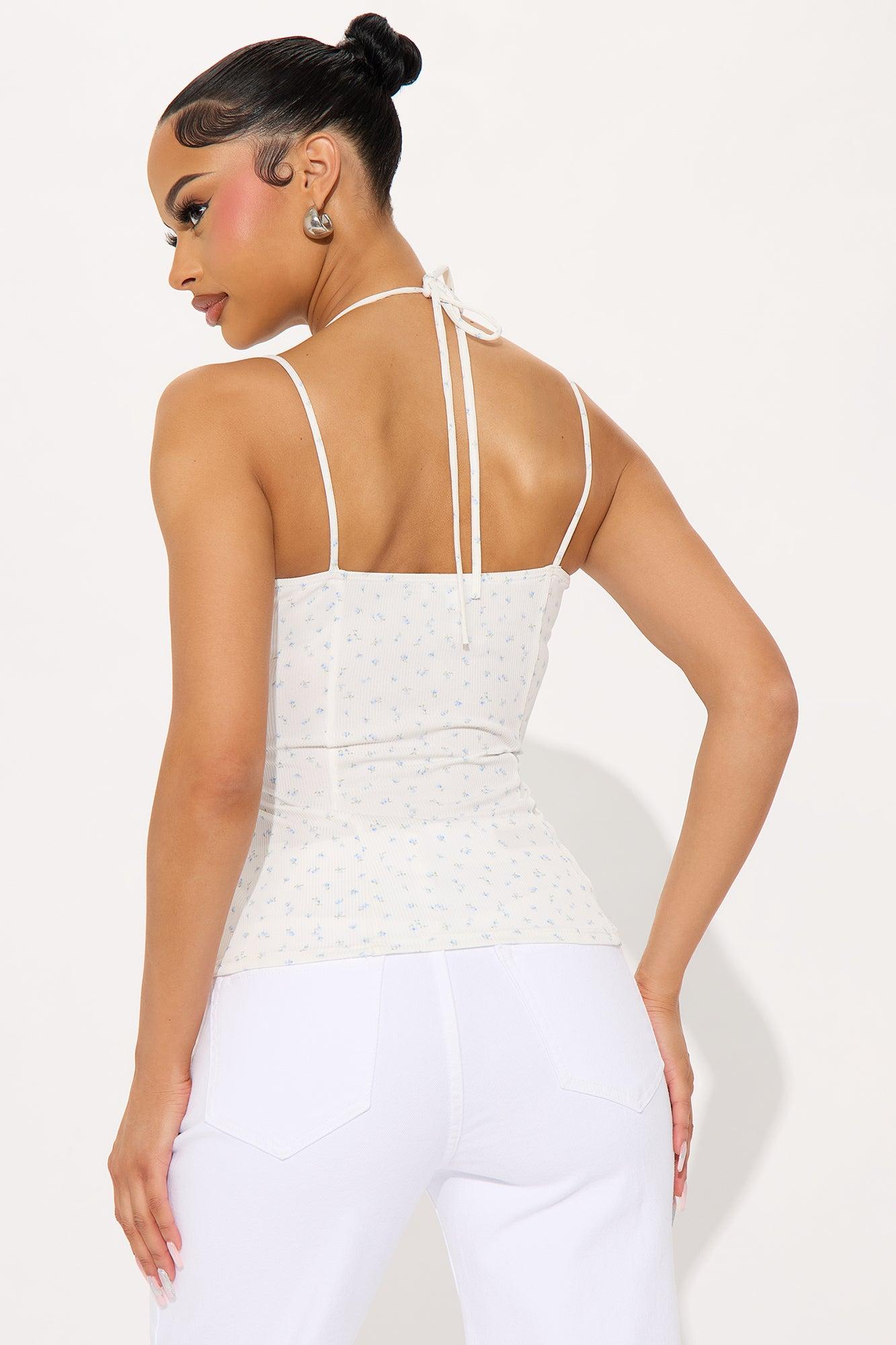 Available In White/combo. Ribbed Top Stretch Halter Detail Tie Neck Spaghetti Straps Lace Trim Hook And Eye Front Closure Seaming Disclaimer : Due To The Printing Process, Each Garment Is Unique 94% Polyester 6% Spandex Imported