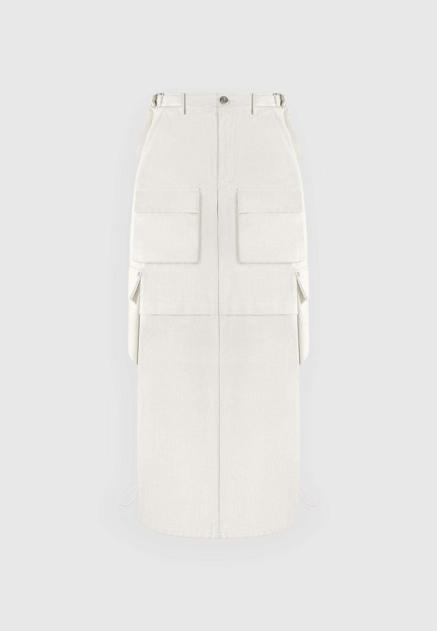 The Cargo Midaxi Skirt is designed to flatter your curves with a chic, high waisted look. It’s perfect for work or play with a stylish yet comfortable design. It's a timeless piece for your wardrobe. High Waisted Midaxi Skirt Silhouette Cargo 3D Pockets Side Slip Pockets Internal Waistband Adjusters Bungee Cords on Side Vegan Leather Manière De Voir Patch 100% CottonAlways check the care label for wash instructions.