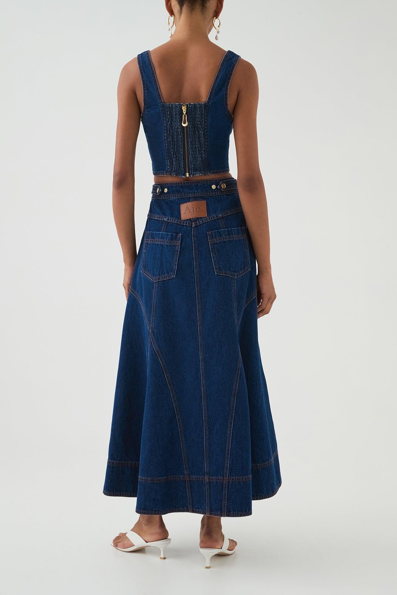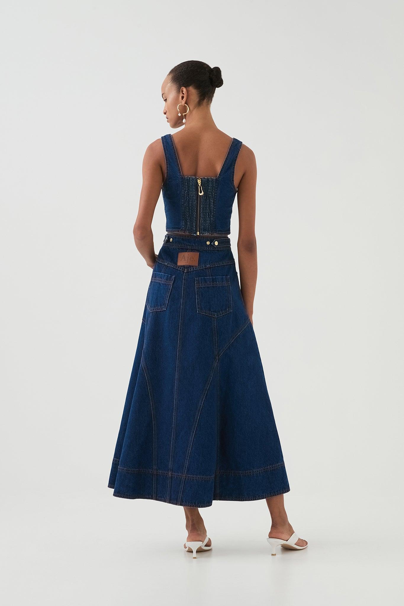 PRODUCT DETAILS Women's denim midi skirt A-line skirt Functional front placket with gold accent buttons Design lines throughout Back patch pockets Waistband tabs with snap buttons Front D-ring detail 100% Cotton Delicate Cold Machine Wash Shop All Skirts SIZE AND FIT Model wears a size 8/S Model: 179cm/ 5’10 Bust: 82cm Waist: 64cm Hips: 88cm