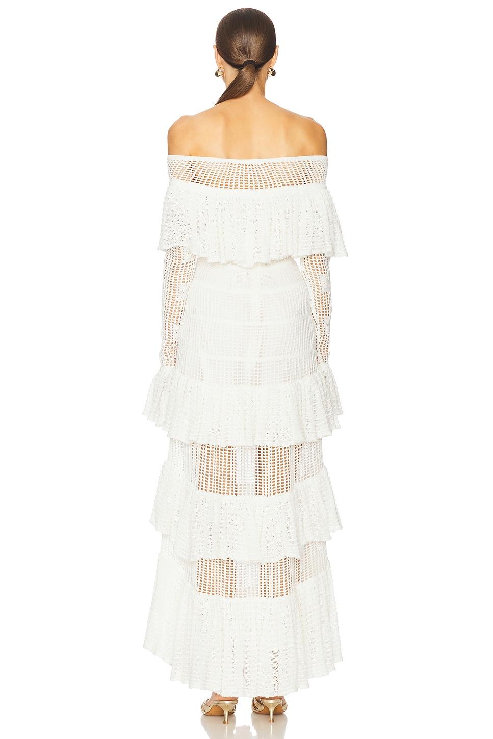 95% polyester, 5% elastane. Hand wash. Detachable slip lining with adjustable shoulder straps, front hook and eye detail, and back zipper closure. Pull-on off shoulder styling with front loop button detail. Midweight crochet knit fabric with bell cuffs and subtly flounced hem. Made in China. Revolve Style No. AXIS-WD887. Manufacturer Style No. A1250449-0458.