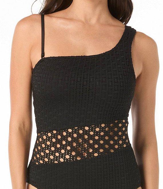 From Carmen Marc Valvo, this one piece swimsuit features: Crochet fabrication One shoulder silhouette Removable soft cups One shoulder strap Removable adjustable strap Moderate coverage Lined Pull-on construction Nylon/spandex Hand wash Imported.