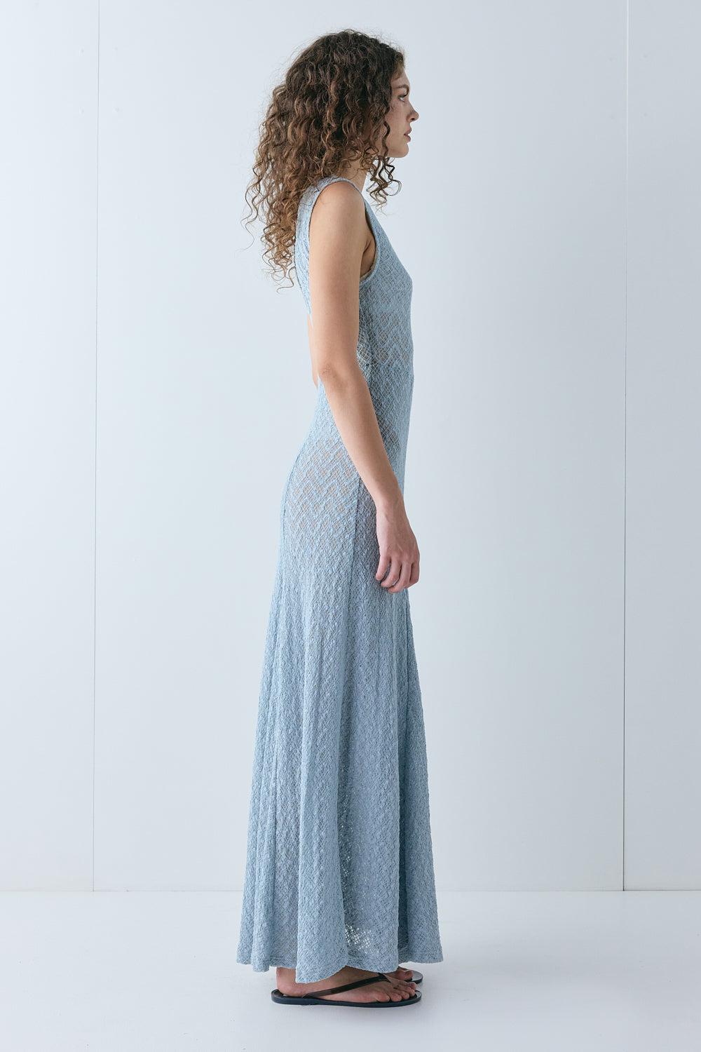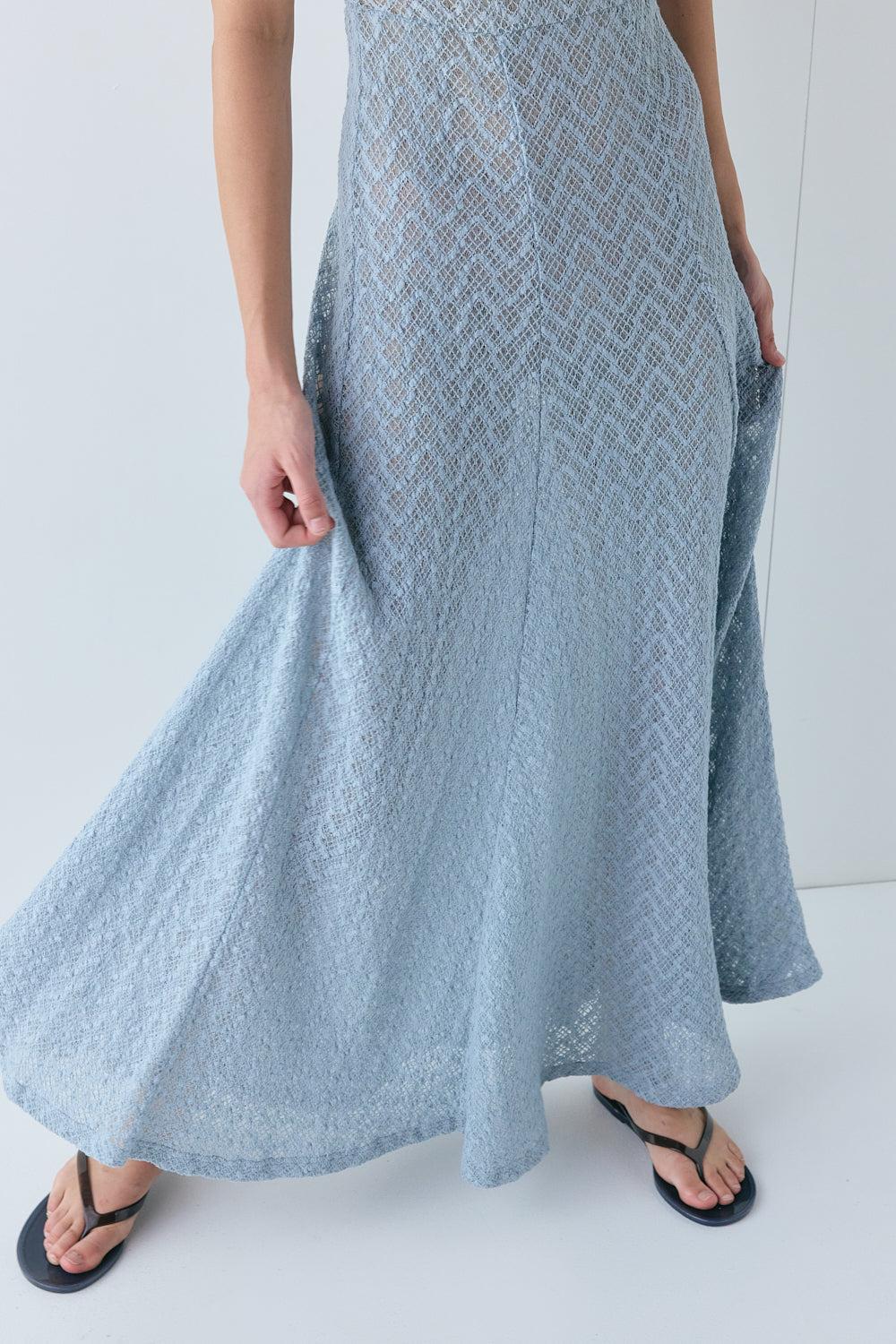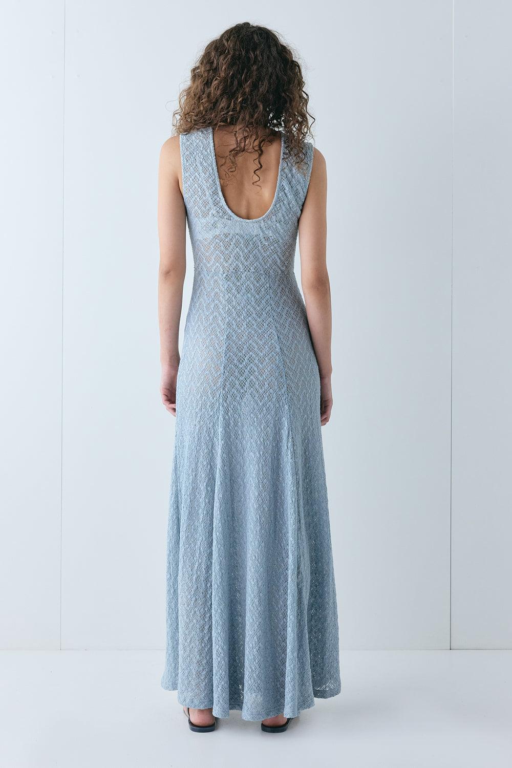 Cut from stretch lace in a soft powder hue, this dress clings just enough before easing out at the hips. Designed to reveal, it traces the body with intention, then gives way to movement. The low back leaves just enough unsaid - a silhouette built for second glances.