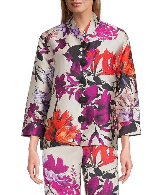 From Caroline Rose, this jacket features: Luxurious mikado woven fabrication Fall bouquet floral print Mandarin collar neckline Cuffed 3/4 sleeves Side seam pockets Straight hem Easy fit Lined Loop over decorative button closure Approx. 24" length Polyester Dry clean Imported.