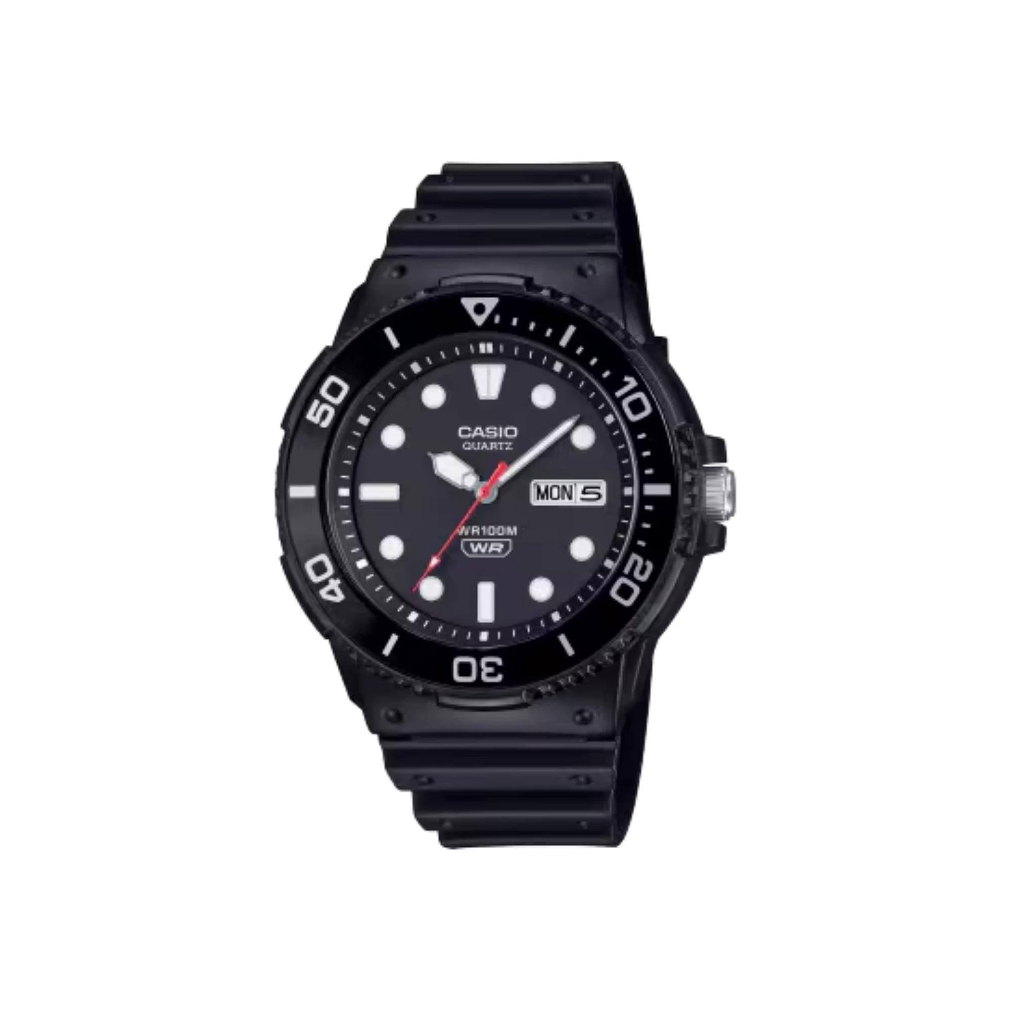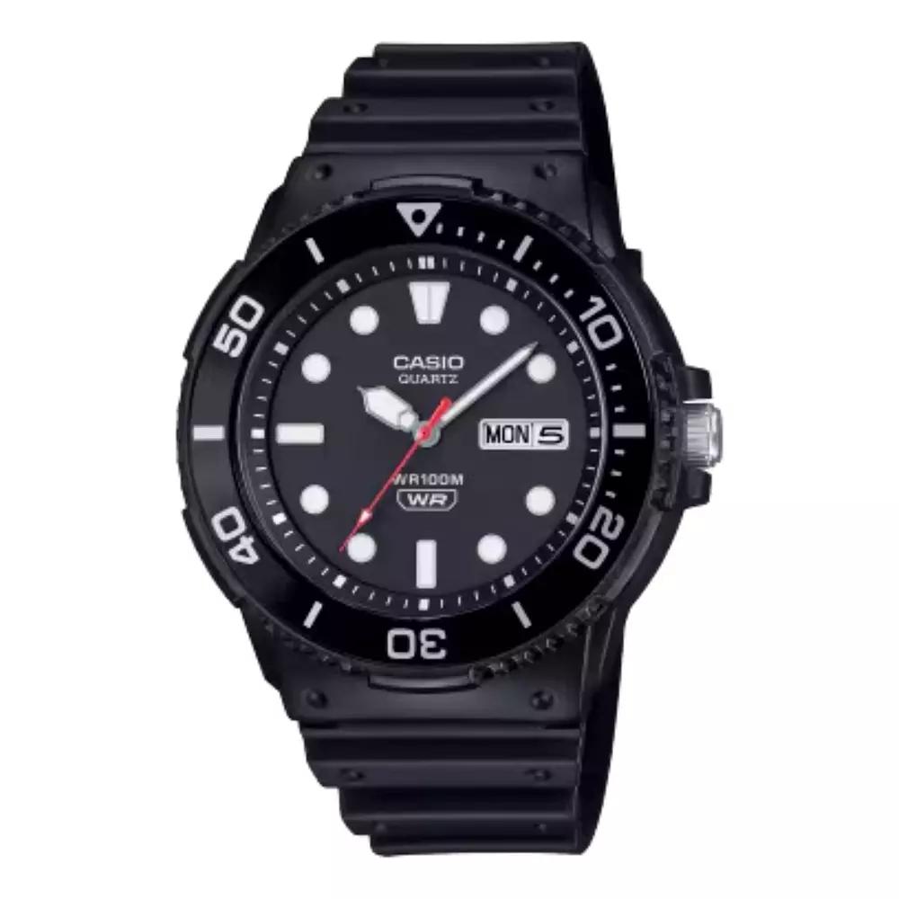Dive into style and functionality with this fantastic marine-inspired watch featuring a dazzling rotating bezel that glimmers just right. With a splash of water resistance up to 100 meters and a handy date-day display, this Casio watch is not just a practical accessory, it's your new favorite companion for all of life's adventures. Click on this JEWELRY & WATCHES GUIDE to learn about fit, styles, materials and more! - https://www.kohls.com/feature/jewelry-guide.jsp#watches. FEATURES: Marine-inspired analog design, Rotating bezel with reflective aluminum ring, Water resistance up to 100 meters, Date-day display for practical utility. DISPLAY: Dial type: matte, Face cover material: acrylic, Illumination: luminescent hands & hour markers. CASE: Screw-down caseback, Caseback material: stainless steel, Material: resin, Diameter: 45 mm. BAND: Band material: resin, Band type: strap, Clasp: buckle, Band circumference: 145 mm - 215 mm, Lug width: 16 mm. DETAILS: Power: Battery, Movement: Quartz, Packaging: Boxed, Model/Style Number: MRW230H, Imported, Manufacturer's 1-year limited warranty: here - https://cs.kohls.com/app/answers/detail/a_id/140. Size: 45MM. Color: Black. Gender: male. Age Group: adult.