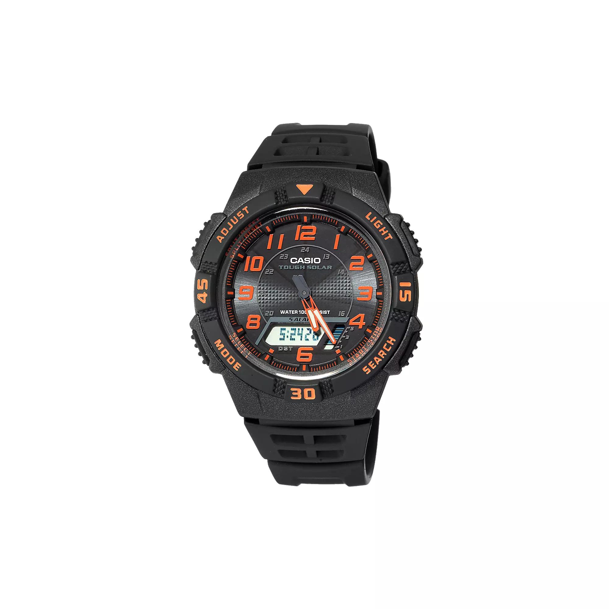 This men's Casio analog and digital dual time watch gives you the best of both worlds. Whether you're on the road or out on the town, this Tough Solar watch is just what you need.Watch the product video here.Features Automatic calendar: day & date, pre-programmed to the year 2099 5 daily alarms Dual time 12/24-hour formats World Time: 31 time zones (48 cities) Chronograph: elapsed & split, 1/100-second for up to 12 hours Solar battery power indicator Days of the week can be displayed in English, Portuguese, Spanish, French, German or Italian. Water resistance: 100 meters Case & Display Black dial Digital display with EL backlight and afterglow Neo-brite luminous hands, markers & Arabic numerals Face cover: mineral crystal Case: black resin Caseback: stainless steel screw-down 42-mm diameter Band Black resin Strap buckle clasp Men's standard length Details Quartz movement Battery power Manufacturer's 1-year limited warrantyFor warranty information please click here Model no. AQS800W- 1B2VCFK Size: One Size. Gender: male. Age Group: adult. Material: Rubber/Silicone.