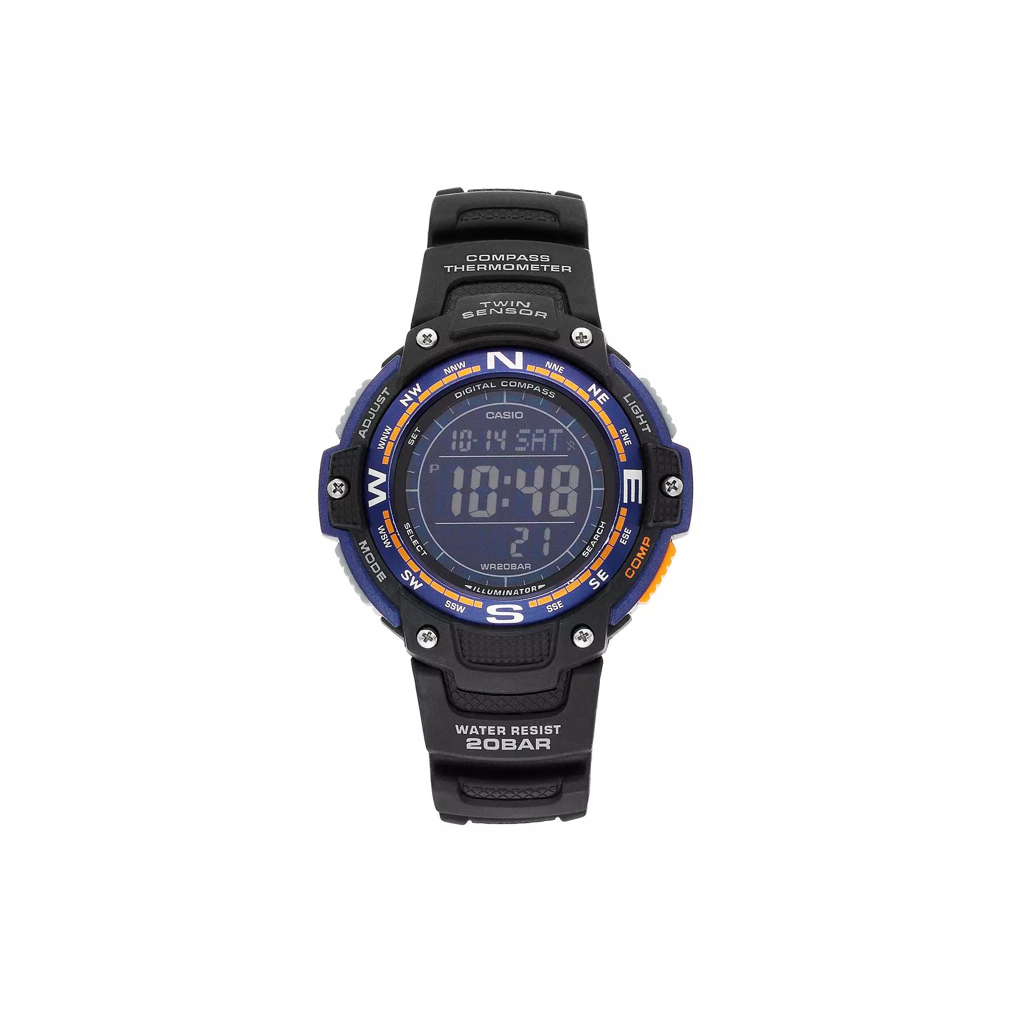Bold accents paired with impressive features make this mens Casio Twin Sensor watch a stylish and functional timepiece.FEATURES 12/24-hour formats 5 daily alarms Countdown timer Stopwatch World time: 48 cities (31 time zones) Water resistance: 200 meters Thermometer Digital compass CASE & DISPLAY Digital display with EL backlight & afterglow Face cover: mineral crystal Case: black resin Caseback: stainless steel BAND Black resin Strap buckle clasp Mens standard length DETAILS Quartz movement Battery power Manufacturers 1-year limited warrantyFor warranty information please click here Model no. SGW100-2BCF Size: One Size. Gender: male. Age Group: adult. Material: Rubber/Silicone.
