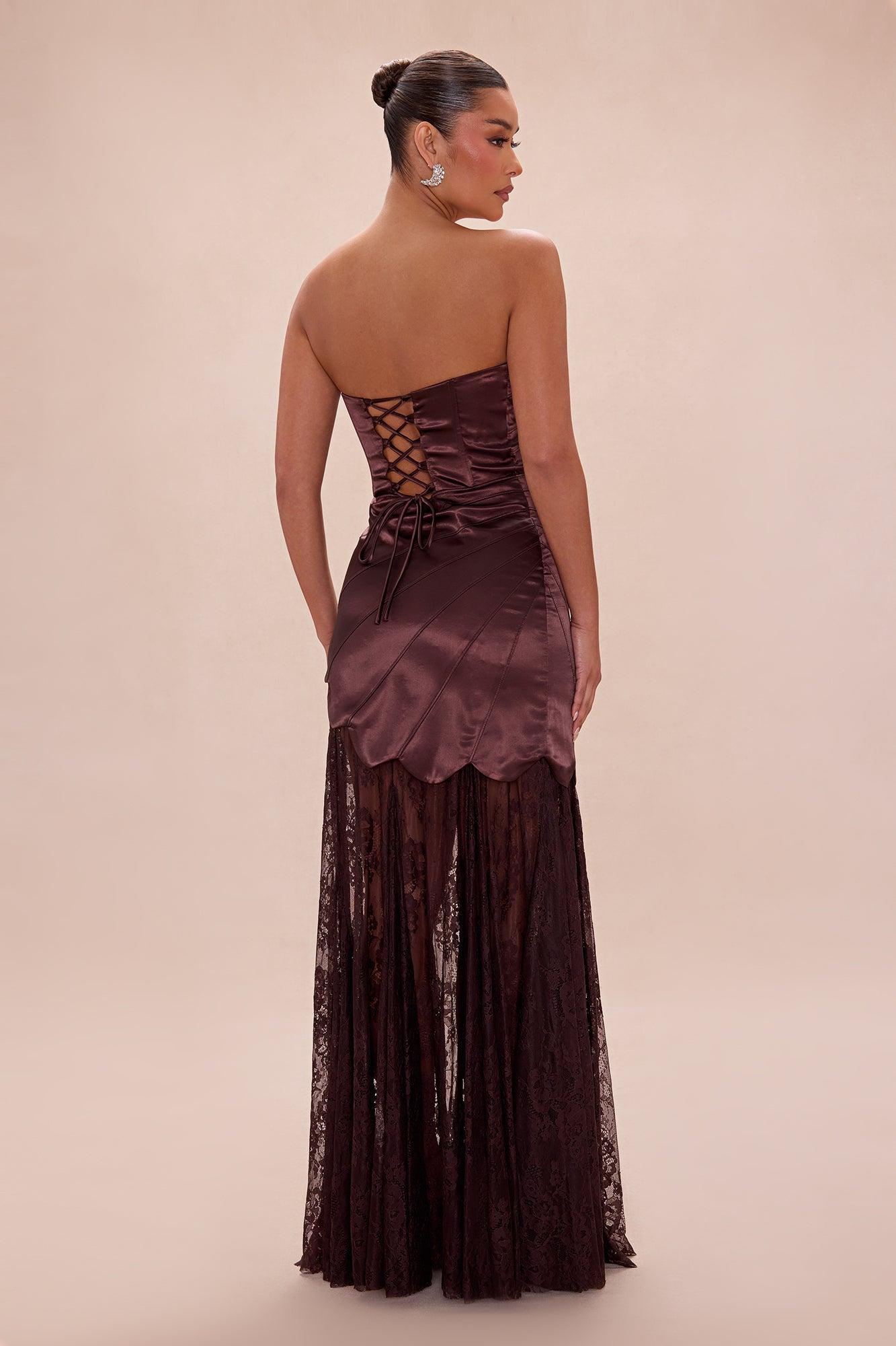 Cassandra Drop Waist Satin Lace Gown - Chocolate Female