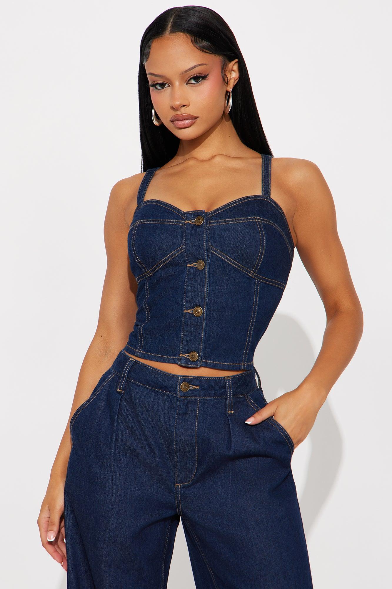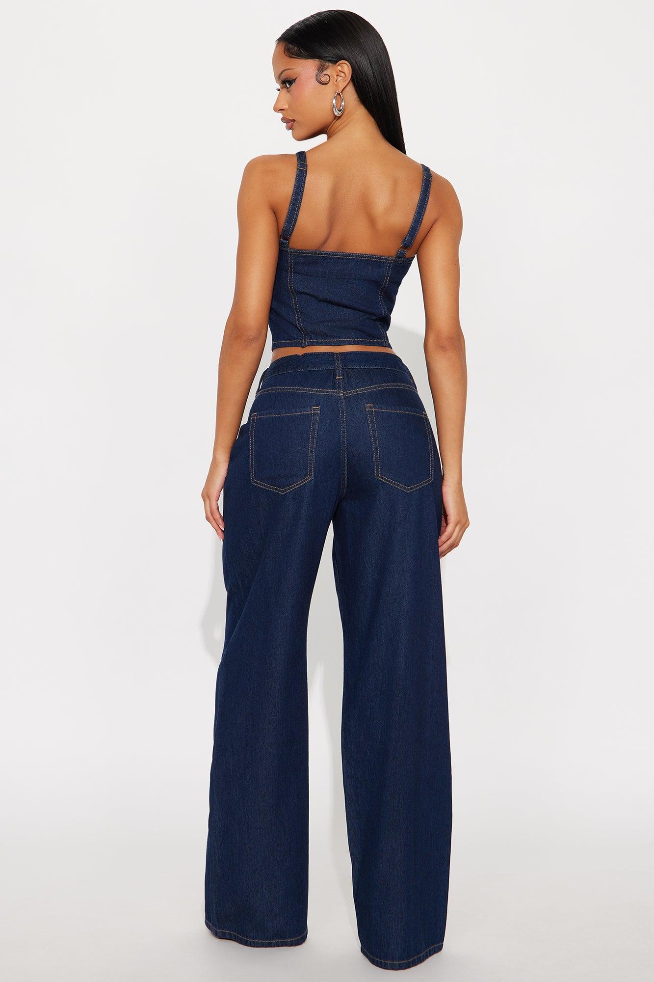 Available In Dark Denim And Vintage Wash. 2 Piece Ensemble Denim Pant Set Spaghetti Strap Button Closure Wide Leg Pant Button And Zipper Closure Belt Loops Pockets Non-Stretch Inseam: 31" Disclaimer: Due To The Specialized Wash, Each Garment Is Unique. Self: 100% Cotton Imported