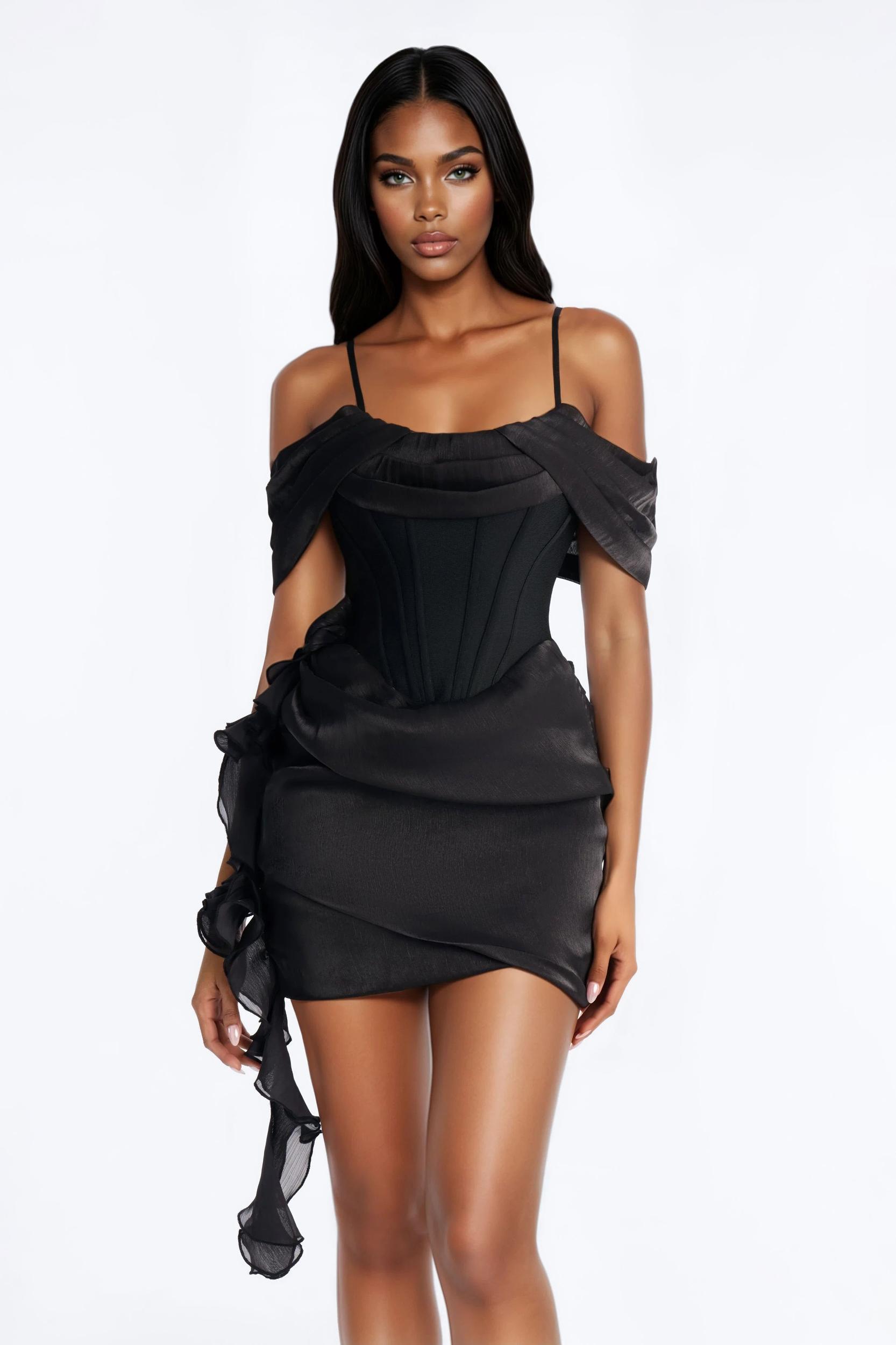 Available In Black And Dusty Blue. Mini Dress Off Shoulder Short Sleeve Adjustable Spaghetti Straps Corset Waist Draped Ruffle Lace Up Back Invisible Side Zipper Lined Length Measured Flat = 32" Self: 95% Polyester 5% Spandex Contrast/Lining: 100% Polyester Imported